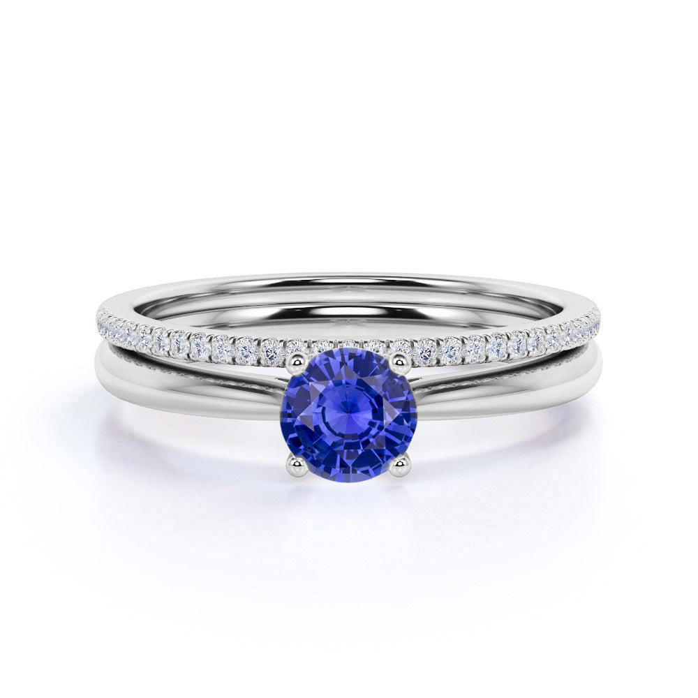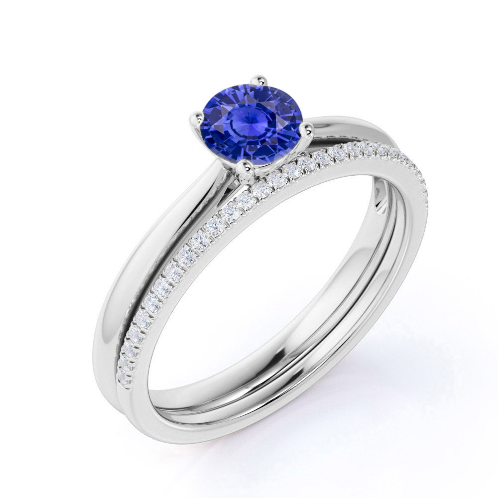 Perfect 1.25 Carat Round cut Sapphire and Diamond Bridal Ring Set in White Gold