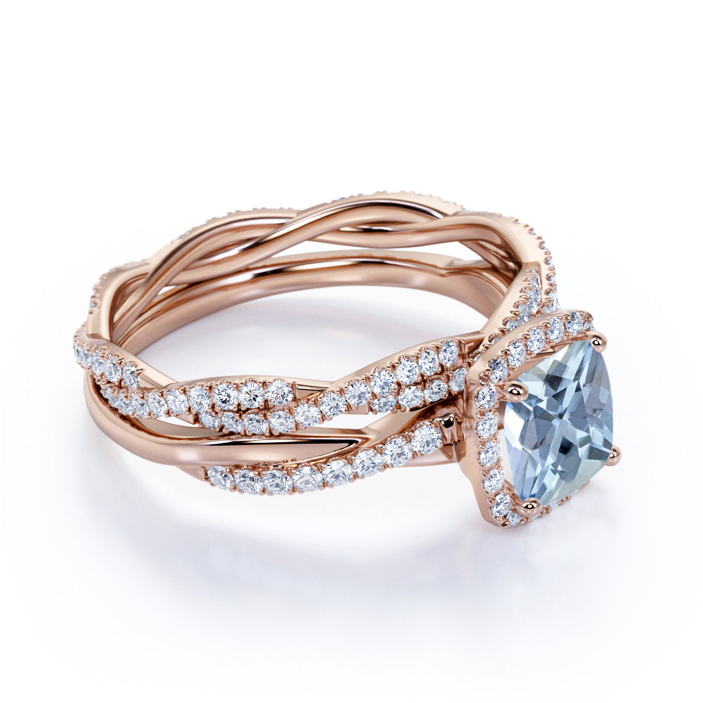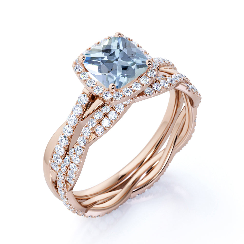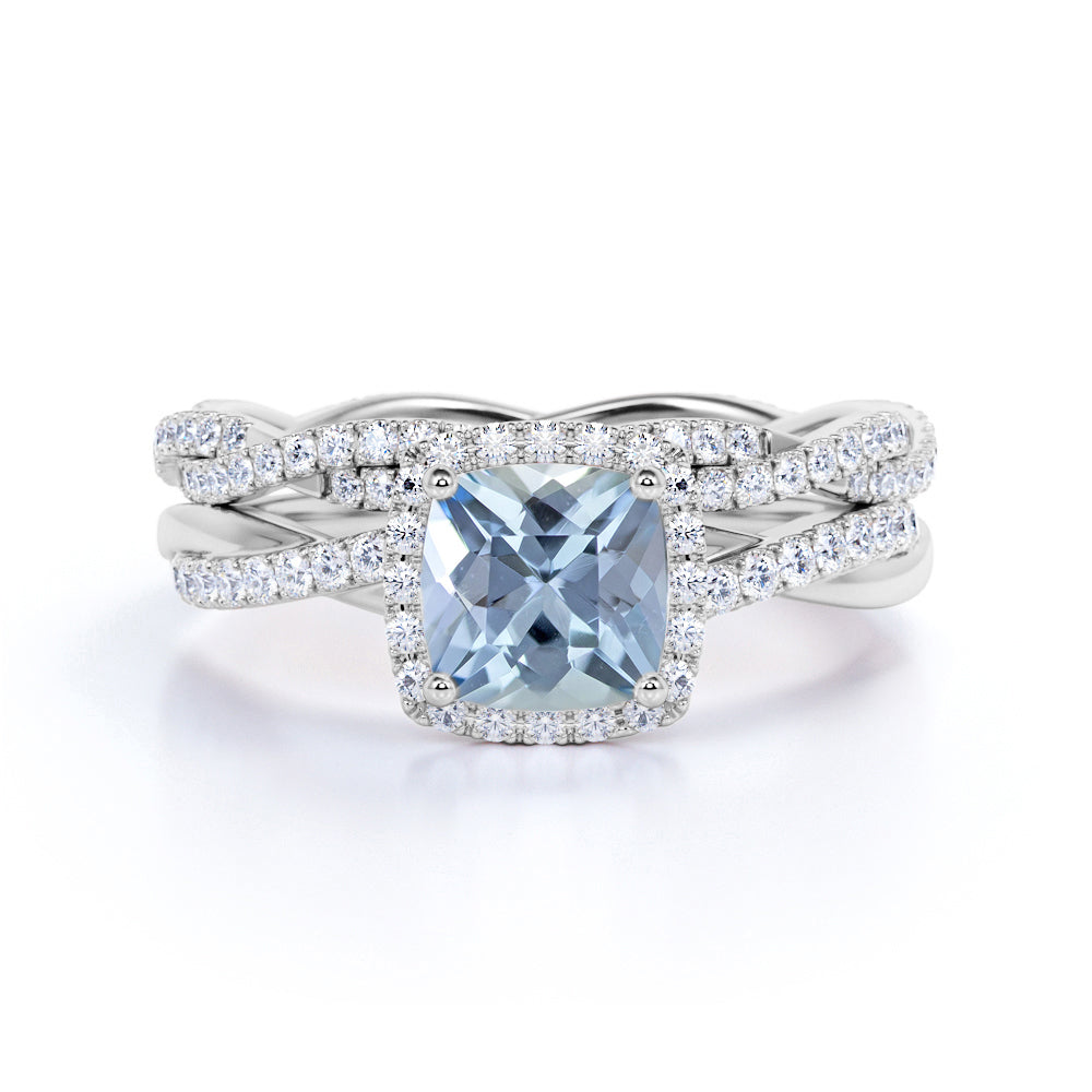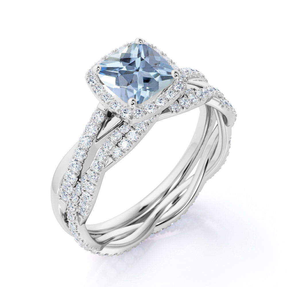 Infinity 1.75 ct Cushion Aquamarine Halo Wedding Ring Set