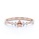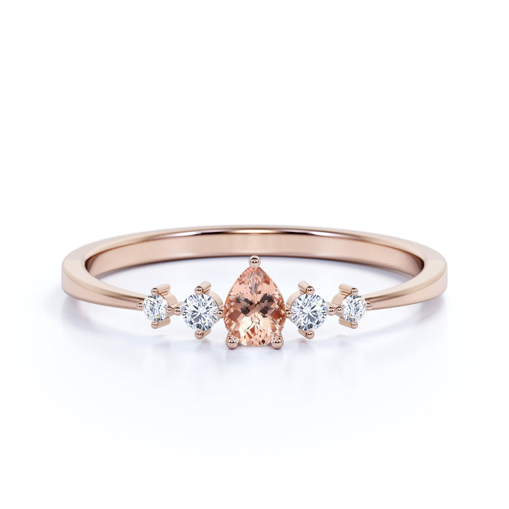 Petite 0.49 Carat Pear Salmon Morganite and 5 Stone Diamond Tapered Shank Engagement Ring in Rose Gold