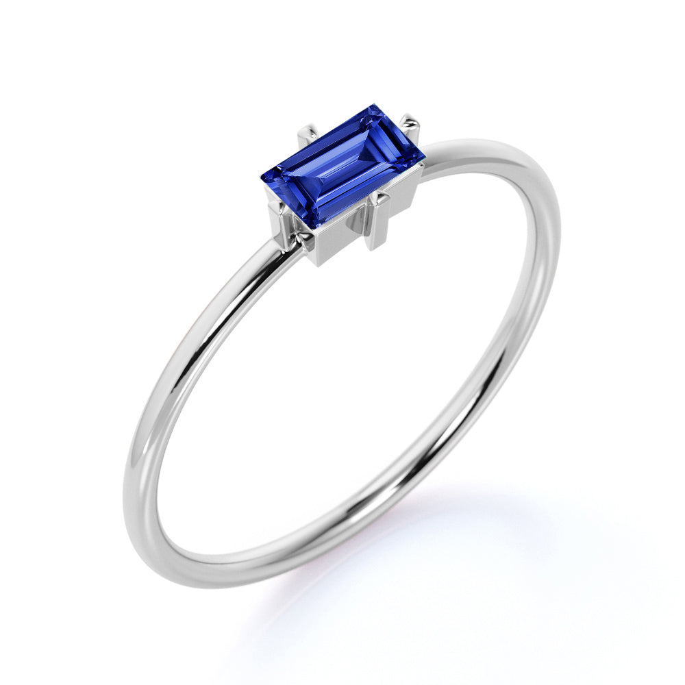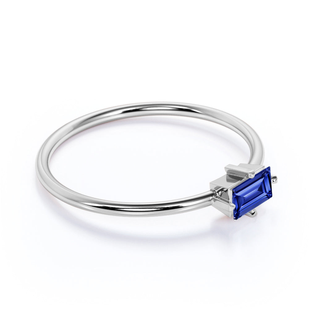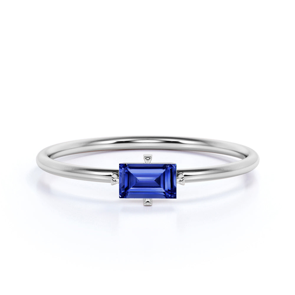 Petite East West 0.50 Carat Emerald Cut Bright Blue Sapphire and 4 Prong Solitaire Engagement Ring in White Gold