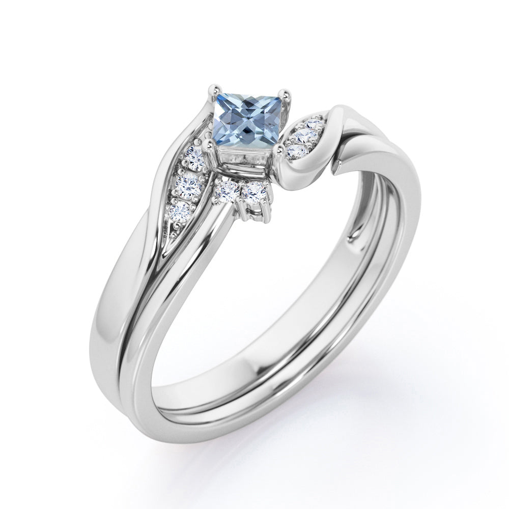 Embrace a new style bridal ring set with this Petite Pave-Channel - 0.55 TCW Rhombus Princess Cut Diamond - Prong Tensioned Wedding Ring Set - Rose Gold. This classic ring set contains two rings; one promise ring and a wedding band. A 0.5 carat princess Aquamarine is placed on the engagement ring with three round Moissanite on each side of it for a silver ring and diamonds for a gold ring. The band is twisted and curved like it is about to merge together. Comes matching with the seven stone ring is an open shank wedding band; the ring possesses four round Moissanite; they are breakdown to dual stones and placed separately.