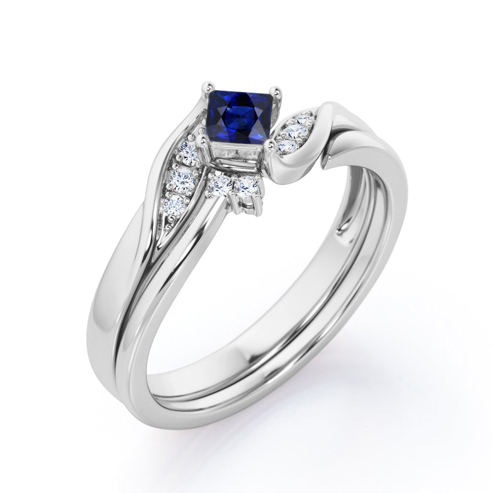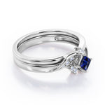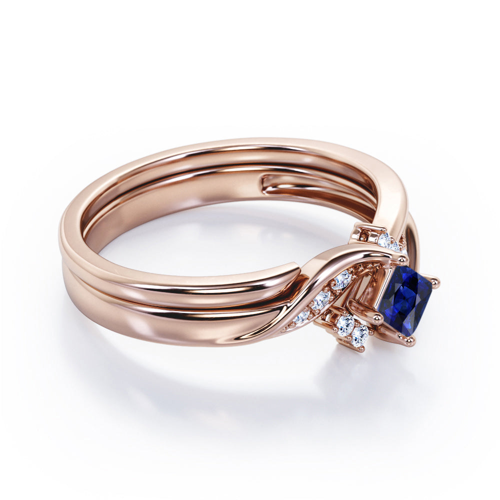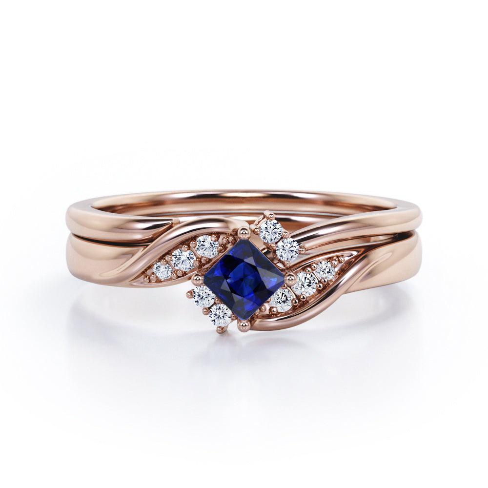 Embrace a new style bridal ring set with this Petite Pave-Channel - 0.55 TCW Rhombus Princess Cut Diamond - Prong Tensioned Wedding Ring Set - Rose Gold. This classic ring set contains two rings; one promise ring and a wedding band. A 0.5 carat princess Blue Sapphire is placed on the engagement ring with three round Moissanite on each side of it for a silver ring and diamonds for a gold ring. The band is twisted and curved like it is about to merge together. Comes matching with the seven stone ring is an open shank wedding band; the ring possesses four round Moissanite; they are breakdown to dual stones and placed separately.