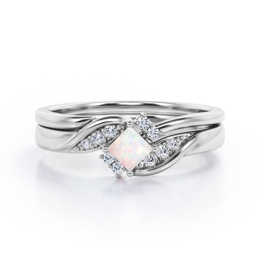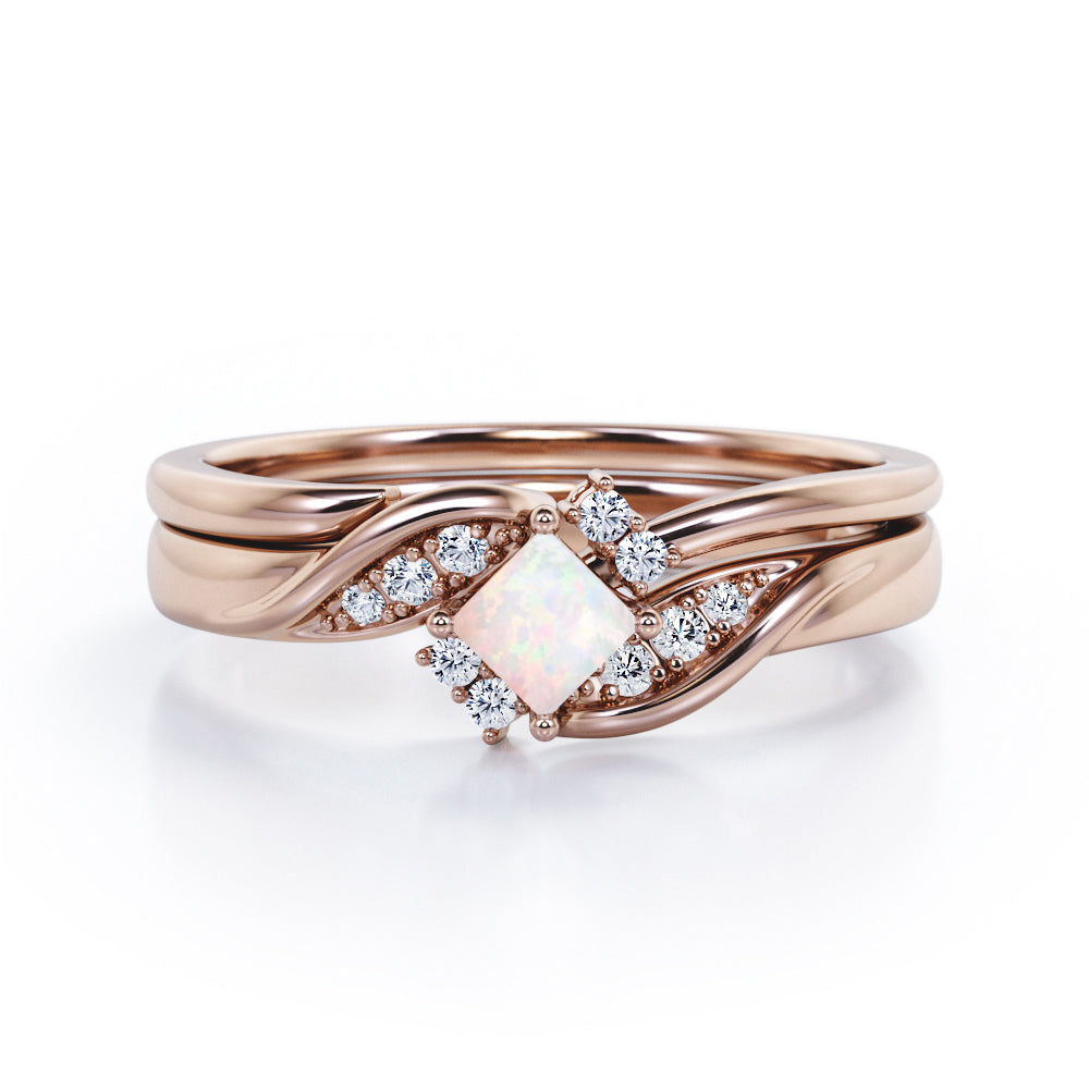 Petite Pave-Channel - 0.55 TCW Rhombus Princess Cut Opal and Moissanite - Prong Tensioned Wedding Ring Set - Rose Gold