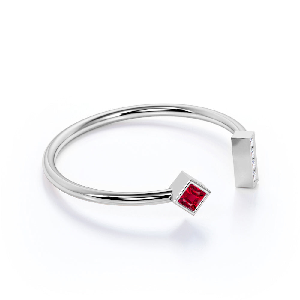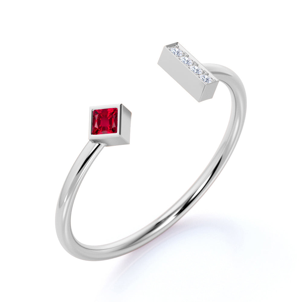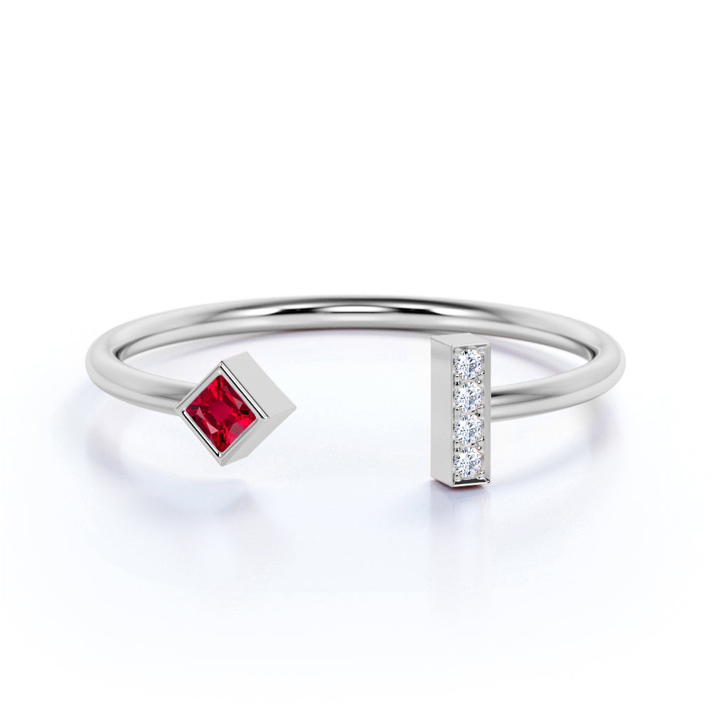 Petite Princess Cut Lab Ruby and Diamond Adjustable Stackable Ring Band in White Gold