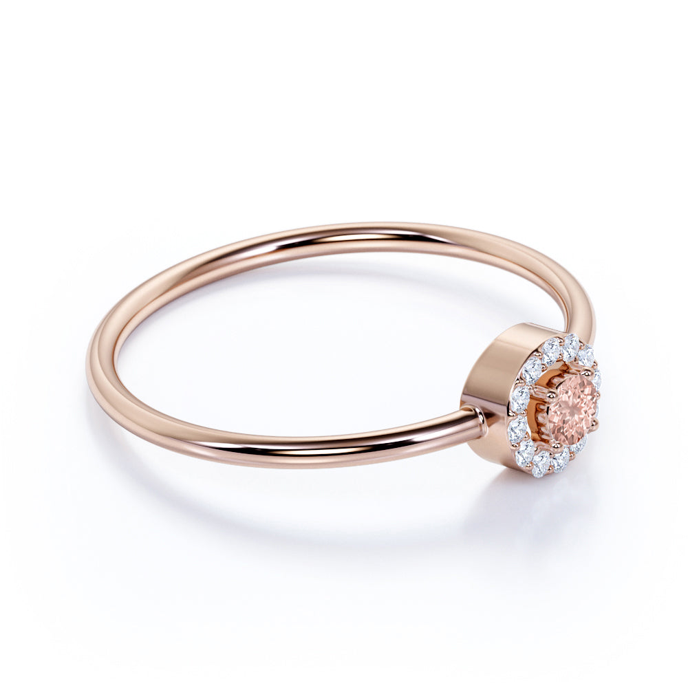 Petite Round Shape Peachy Pink Morganite and Diamond Halo Engagement Ring in Rose Gold