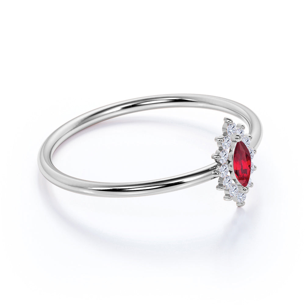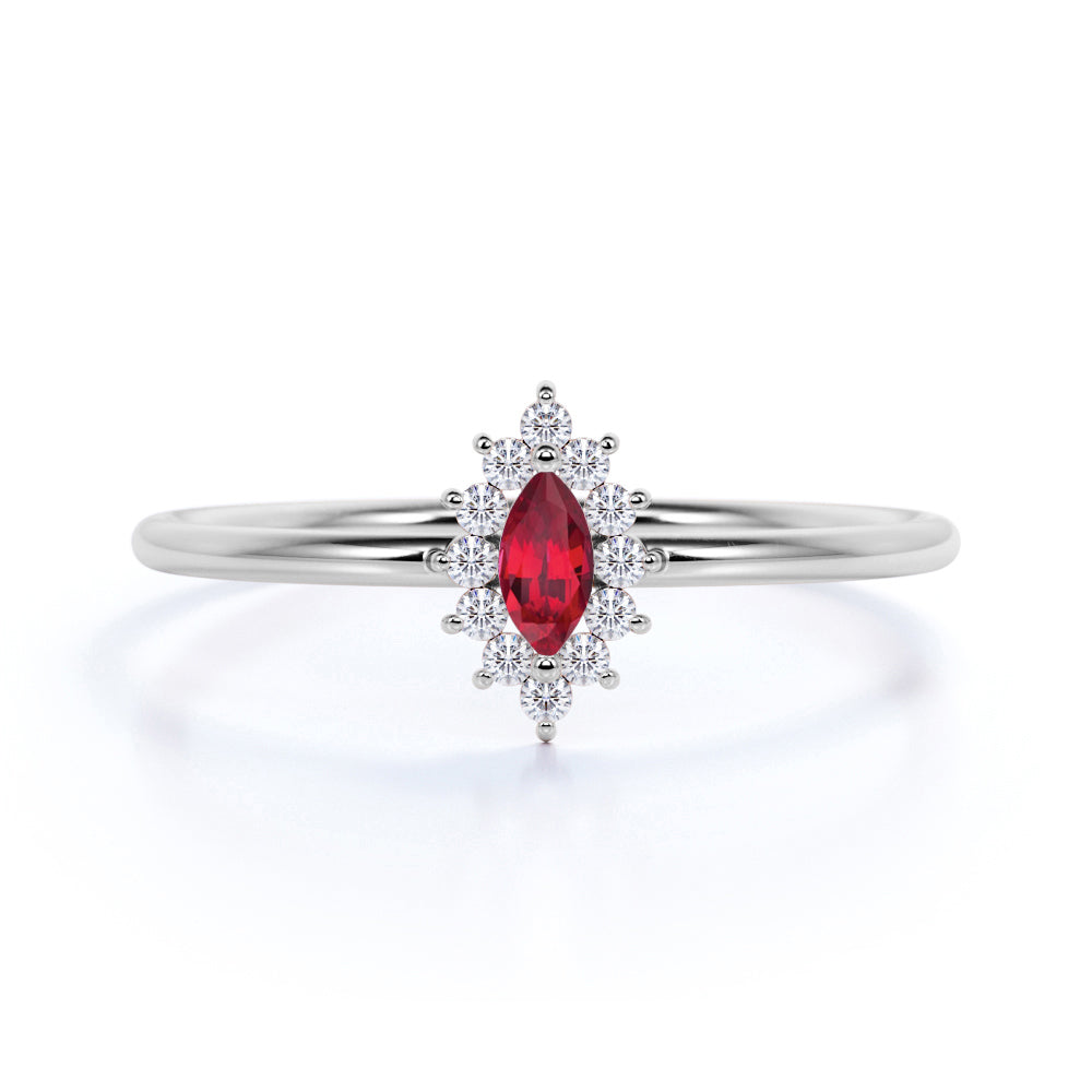 Perfect for any occasion, birthday gift, anniversary gift, promise ring or just a simple gift for your loved ones. The vintage Lab Ruby ring is quite amazing, since majority of us likes to see a vintage look, especially with an engagement ring that is absolutely beautiful. This mini small Lab Ruby ring features an approximately .35 carat marquise cut certified Lab Ruby, surrounded by .15 carat authentic diamond accent, for a total weight of 0.50 carats.