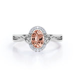 This is a very beautiful handmade Morganite and Diamond Halo Engagement Ring for women. The plain band engagement ring is made with natural morganite, real diamonds and on real gold. The handcrafted engagement ring features 1.25 carat oval cut morganite in the center, and have the 0.25 carat of diamonds for a total carat weight of 1.50 Carats.