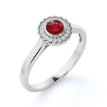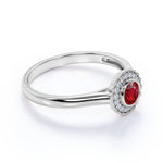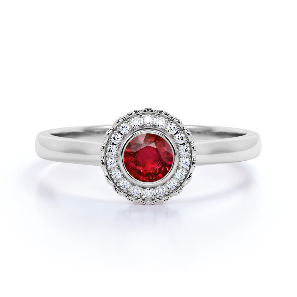 Plain Shank 1.25 Carat Round Cut Ruby and Diamond Bezel Halo Engagement Ring in White Gold