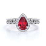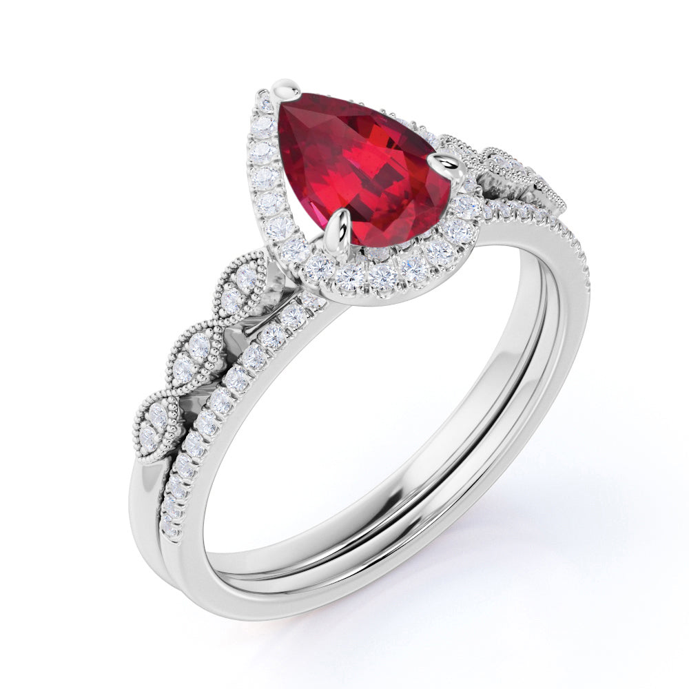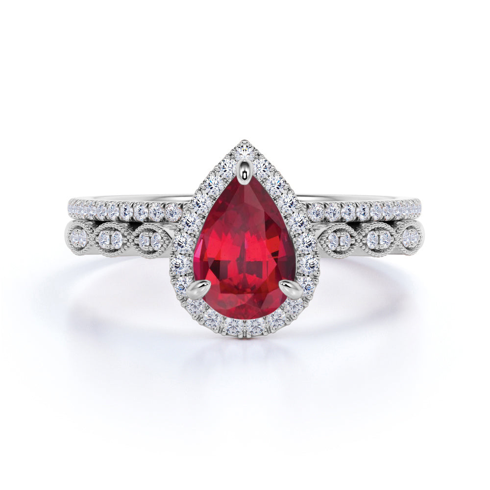 Vintage Art Deco Milgrain 2 Carat Pear Cut Lab Ruby Bridal Set with Diamond Pave Wedding Bands in White Gold
