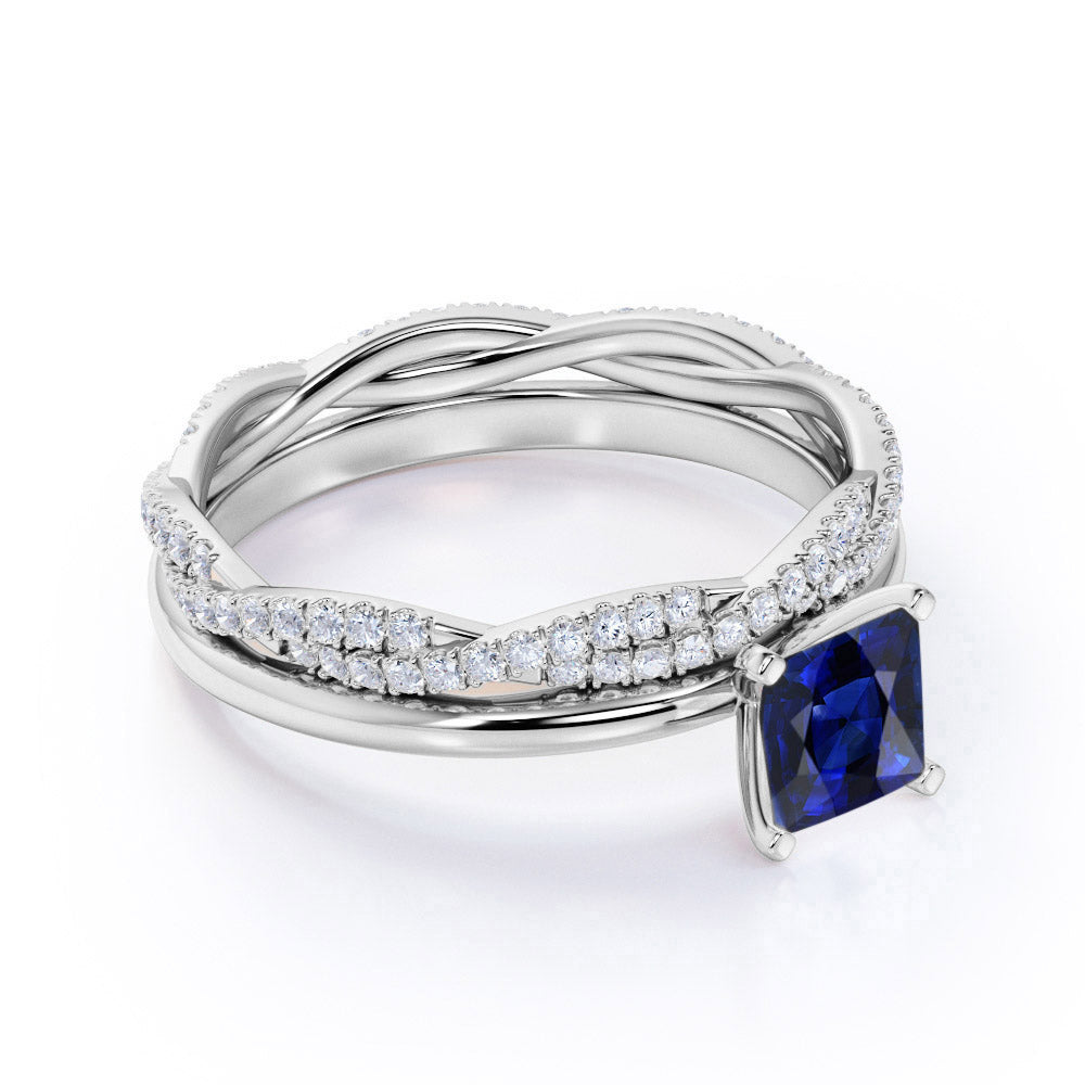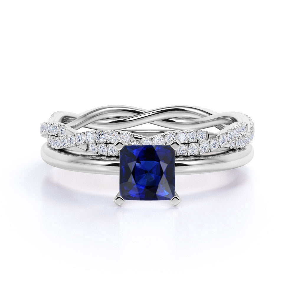 Plain Shank 2 Carat Princess Cut Sapphire Bridal Set with Diamond Infinity Wedding Band in White Gold