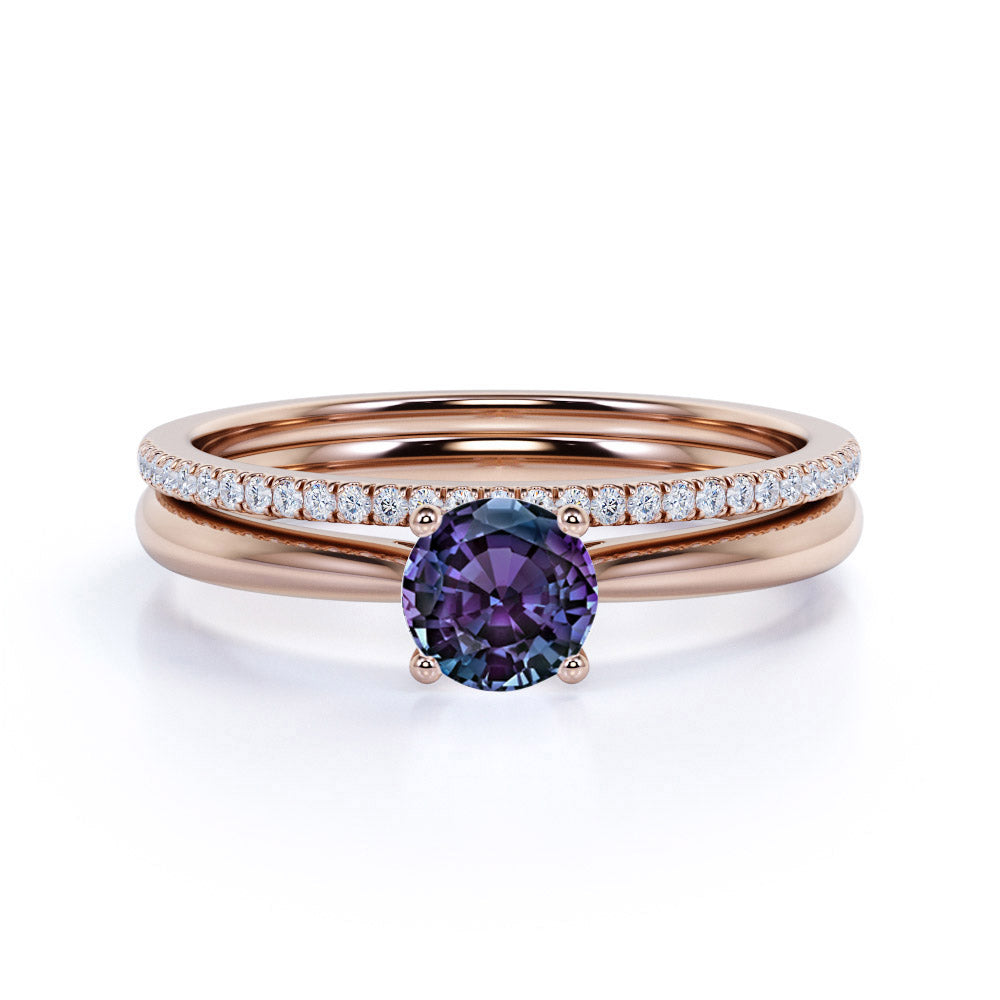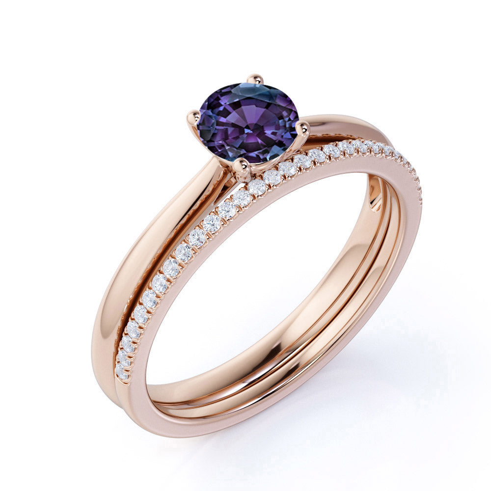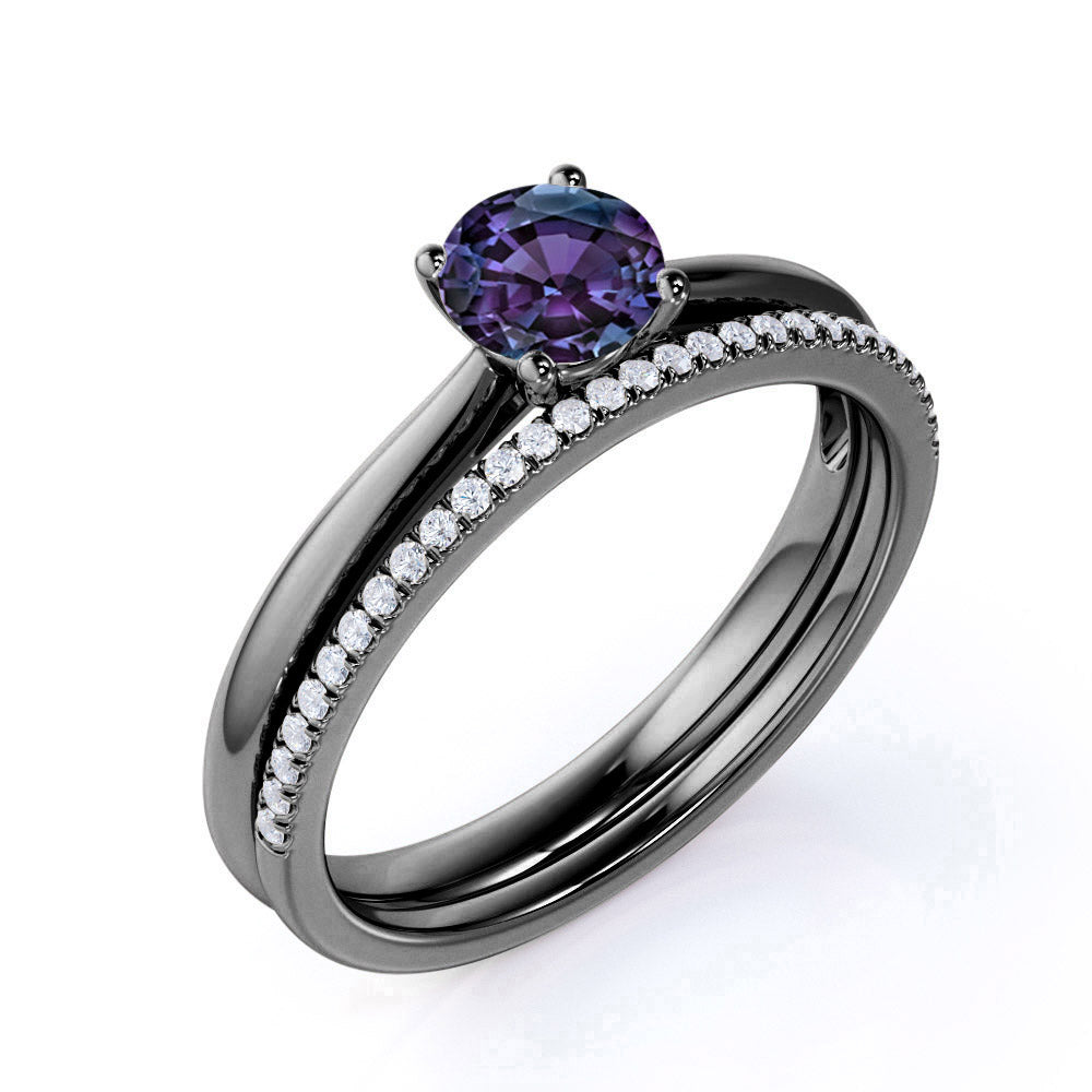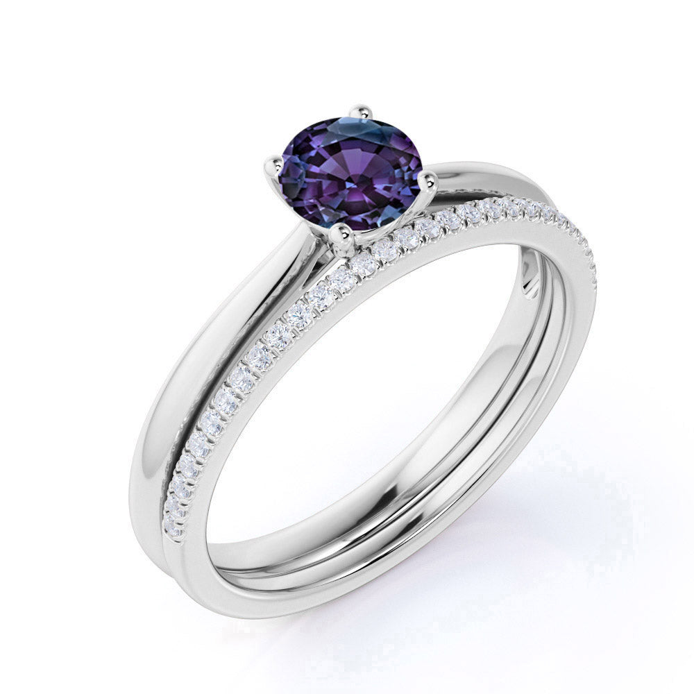 Plain Shank Solitaire 1.25 Carat Round Cut Simulated Alexandrite and Diamond Pave Bridal Set Rings