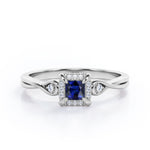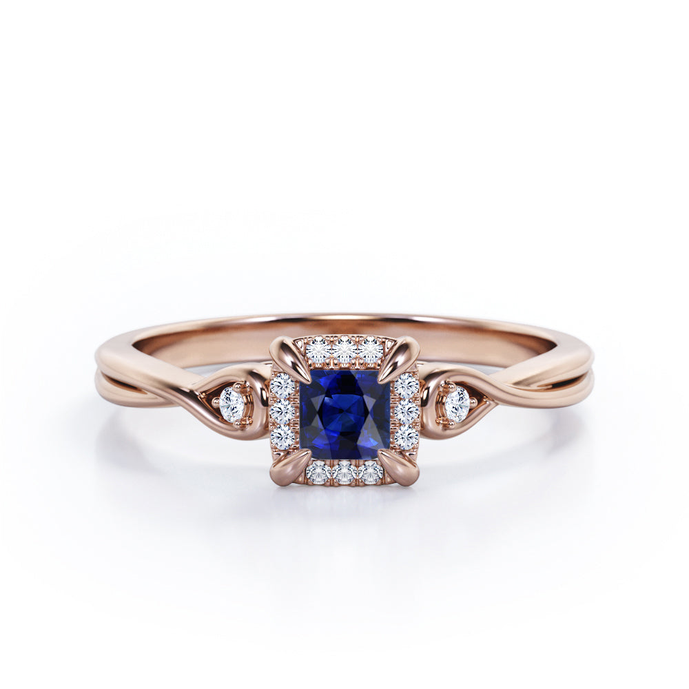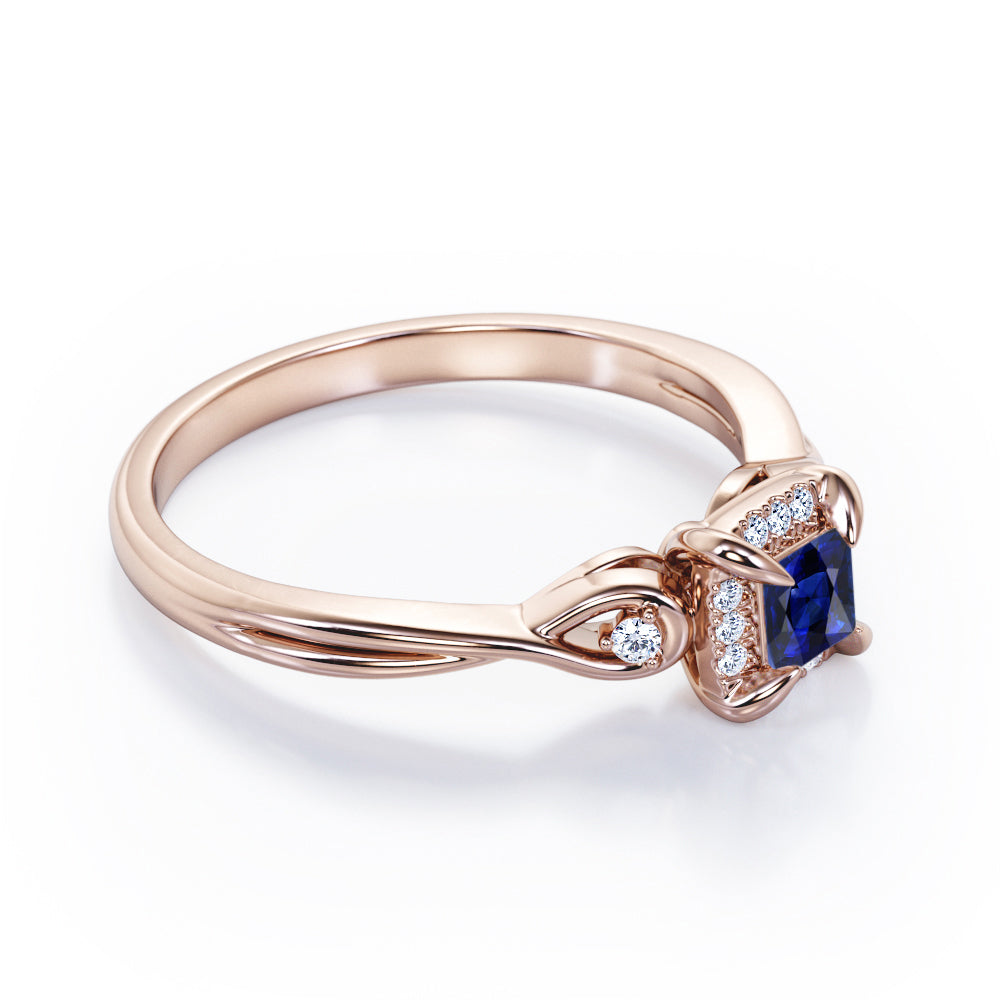 A Prong and Halo 0.6 carat Princess Lab-Created Sapphire and Diamond Twisted Shank Engagement Ring in Rose Gold showcases a 0.5 carat princess cut Blue Lab-Created Sapphire that is framed by a round paved Diamond halo and secured with four massive prongs. Normally you can see prongs in smaller sizes but these huge claws make the ring looks unique and it becomes a part of the design. The band is twisted and crossed like an infinity sign. The promise ring can be made in 18k gold over silver, 10k gold and 14k gold with the color of white gold, rose gold, yellow gold and black gold.