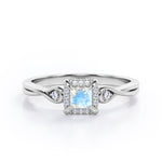 A Prong and Halo 0.6 carat Princess Moissanite and Diamond Twisted Shank Engagement Ring in White Gold showcases a 0.5 carat princess cut Moonstone that is framed by a round paved Moissanite halo and secured with four massive prongs. Normally you can see prongs in smaller sizes but these huge claws make the ring looks unique and it becomes a part of the design. The band is twisted and crossed like an infinity sign. A dainty round Moissanite is also placed within. The promise ring can be made in 18k gold over silver, 10k gold and 14k gold with the color of white gold, rose gold, yellow gold and black gold.