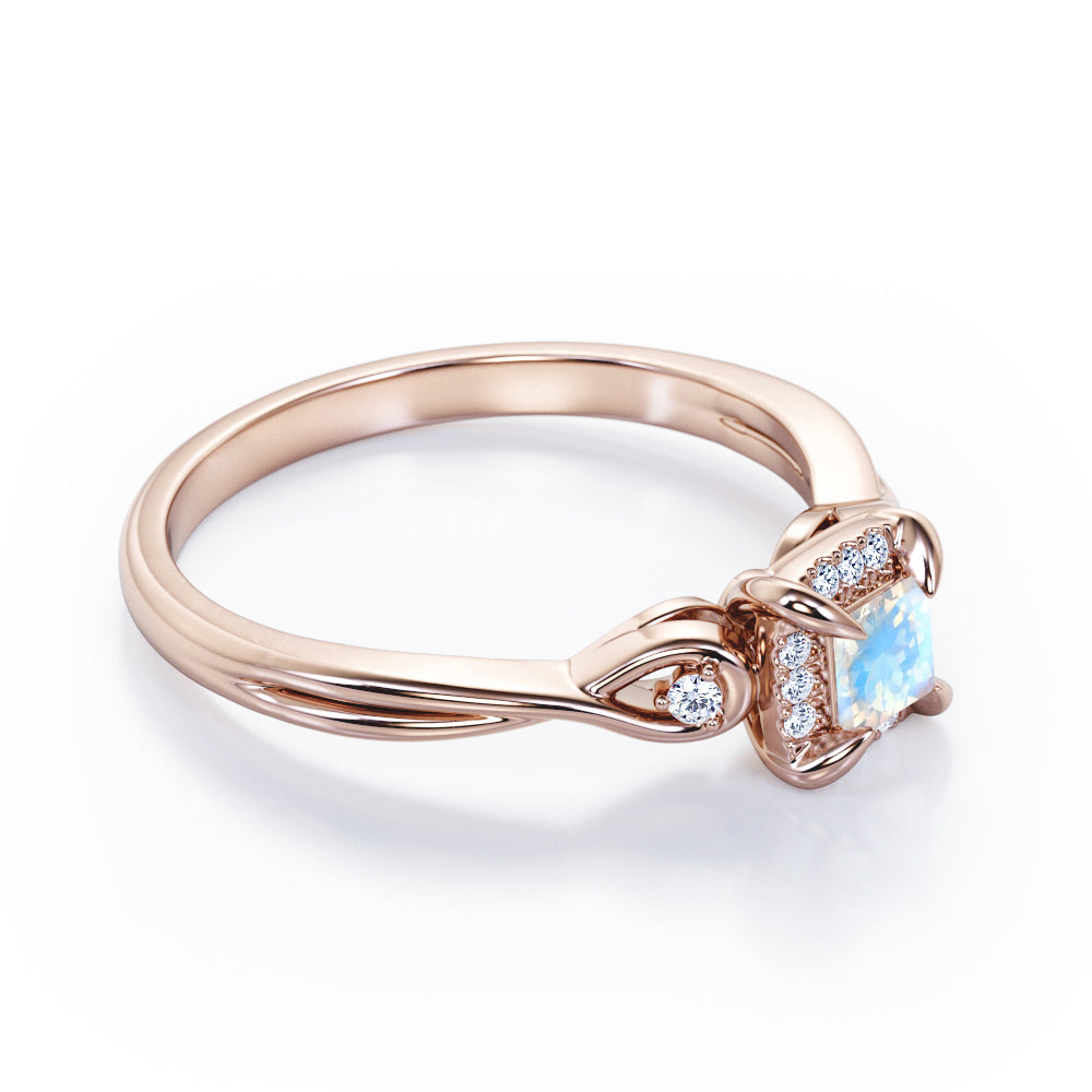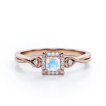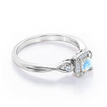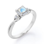 Prong and Halo 0.6 carat Princess Moonstone and Moissanite Twisted Shank Engagement Ring in White Gold