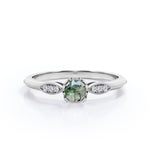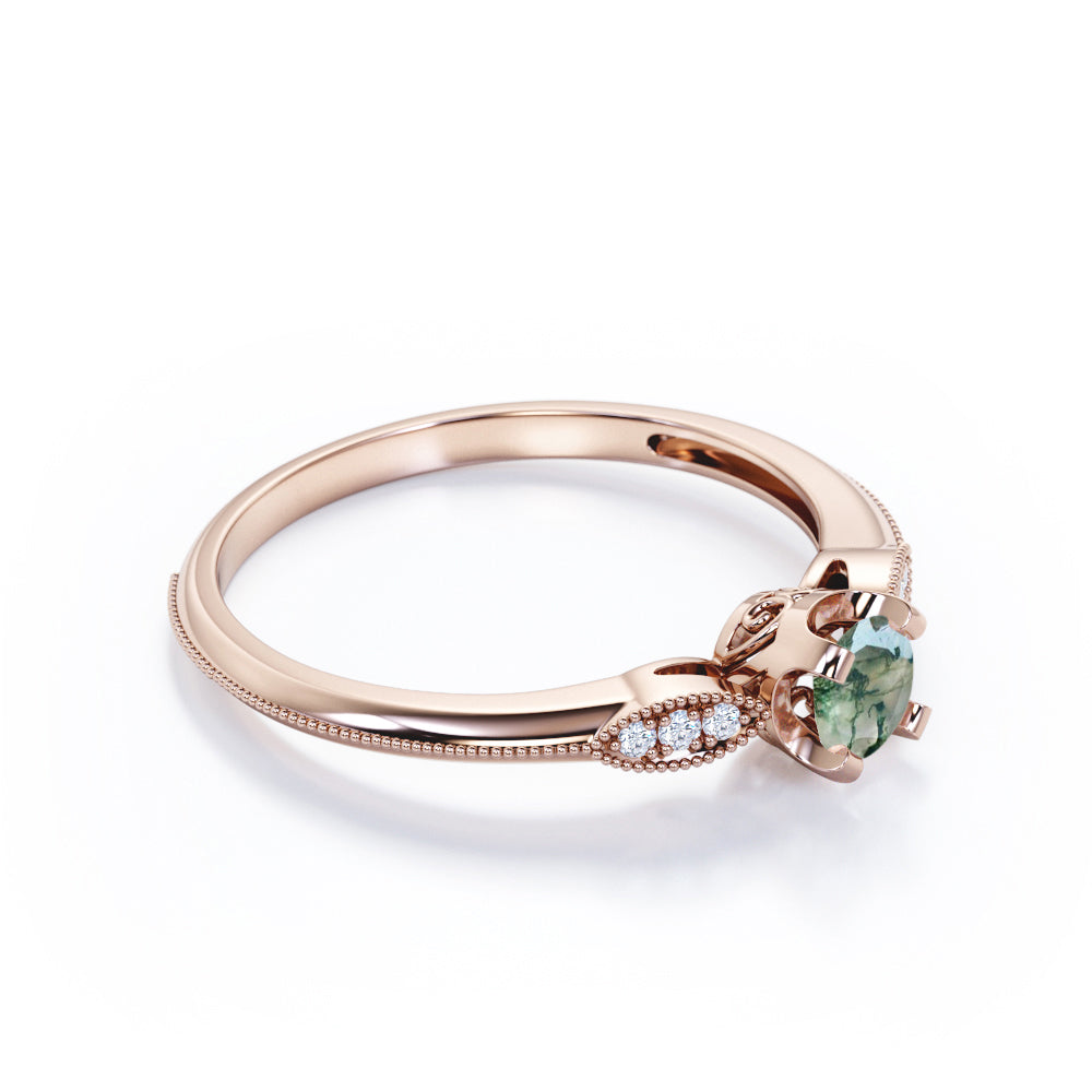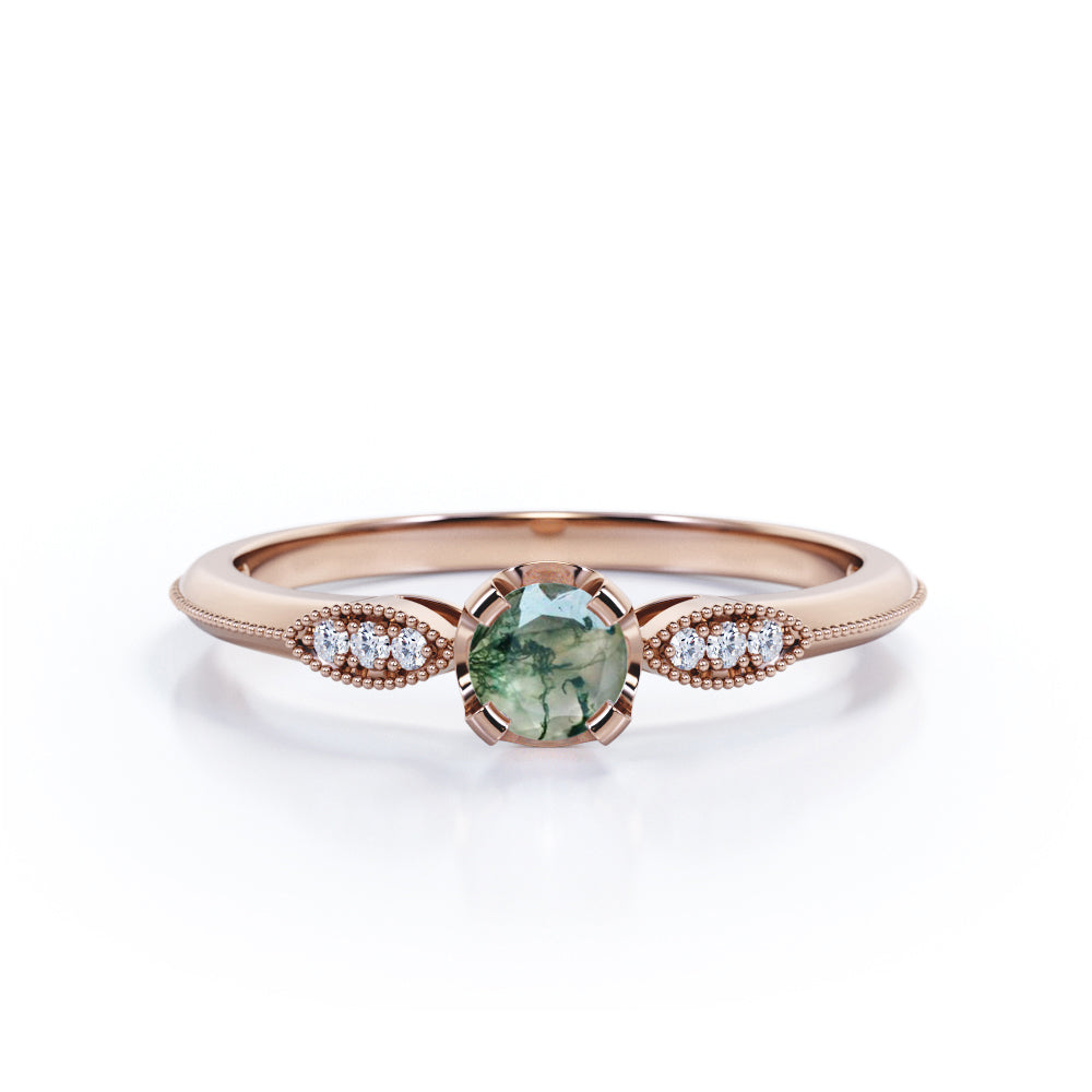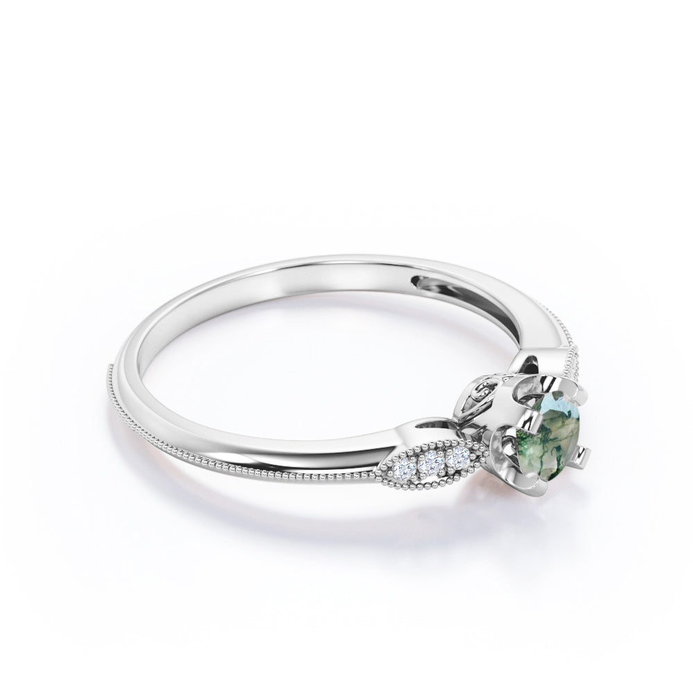 With its very quirky mossy inclusions, this Prong Basket 1.25 Carat Round Cut Solid Druzy Moss Green Agate and Diamond Pave Milgrain Engagement Ring will perfectly fit your unique love story. This classic agate ring features 1 carat round cut natural moss green agate and .25 carat real genuine side diamond for gold ring and moissanite for silver ring. This simple engagement ring can be customized to either 10k, 14K and Gold over Silver and either Black Gold, Rose Gold, White Gold or Yellow Gold. Also, as your satisfaction is our most priority, we will do our best to have your handmade jewelry be carefully and beautifully crafted by our expert jewelers. The order also comes with a 30-day full refund policy. If you are looking for the encouragement to move forward, this solid crystalline moss green Agate ring is right for you. It is crowned as a crystal of gardeners and agriculture. Encourage trust and hope with this real green Agate ring that shows a variety of white with green inclusions that resembles moss. Due to its unique milky white color with green dendritic inclusions, this vintage moss green Agate ring is sure to enchant its wearer. With its long history and many oral traditions around the world, this delicate druzy moss green Agate ring is sure to be eye-catching and bring all eyes on you. It can be customized as per your satisfaction and available in both silver and gold metal. It perfectly fit those who are looking for a very unique ring that no two rings are alike. Crowned as a stone of power and wealth, this green Agate with mossy inclusions ring will attract abundance in all forms. Sparkle your finger with this ring which is perfect for any occasion and everyday wear. Handcrafted with love, this antique ring will complement any style and enhance the charm of its wearer.
