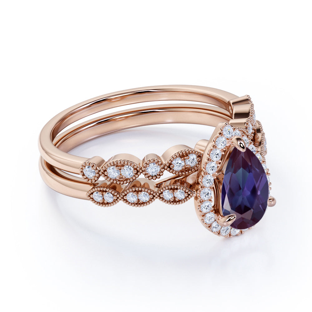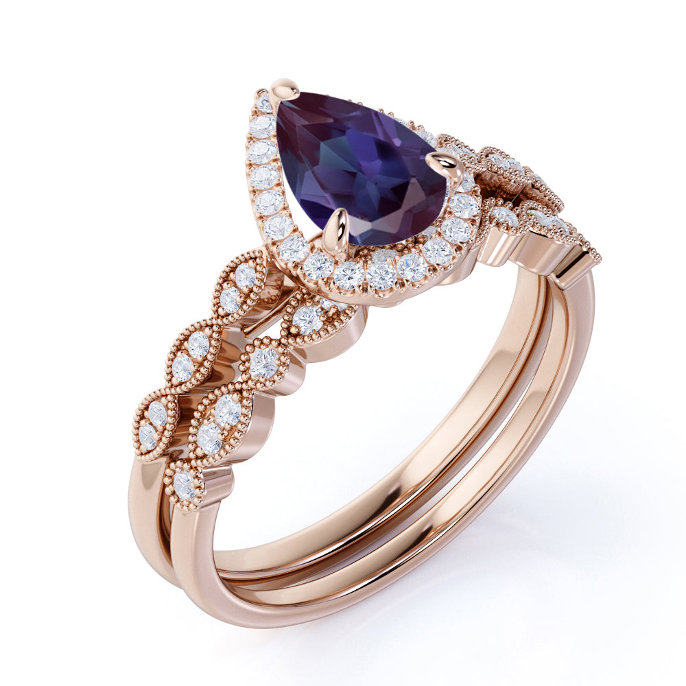 Be on cloud nine with this Prong Halo 1.75 Carat Teardrop Shape Lab Created Alexandrite and Diamond Marquise Dot Milgrain Engagement Ring. This antique ring features 1 carat pear cut lab grown Alexandrite and .75 carat real genuine side diamond for gold ring and moissanite for silver ring. This beautiful engagement ring can be customized to either 10k, 14K and Gold over Silver and either Black Gold, Rose Gold, White Gold or Yellow Gold. Also, as your satisfaction is our most priority, we will do our best to have your handmade jewelry be carefully and beautifully crafted by our expert jewelers. The order also comes with a 30-day full refund policy. Enrich your charm and charisma with this vintage mystic lab grown Alexandrite ring for women that is excellent for everyday wear. With its unique ability to exhibit two colors, this ring will make you stand out from others. This flawless ring will be a perfect fit for you love story as it is believed that joy enters the lives of people through the stone. Enrich your charming love story and strengthen your bond with this color-change man made Alexandrite ring. This simulated Alexandrite ring gives a vivid grass green color in daylight and displays an intense raspberry red in candescent light. Create a fascinating look on your finger with this lab created Alexandrite ring for women which is available in both solid gold and sterling silver. This ring will bring love and hope to its wearer. This ring is available at a very affordable price yet it offers a very expensive and gorgeous look on your finger. Sparkle your finger with this mystic lab made Alexandrite ring which is perfect for any occasion and everyday wear. It is the perfect match for those who are looking for a remarkable gemstone rings as Alexandrite embodies their own unique color-change ability and uplifting meaning.