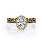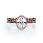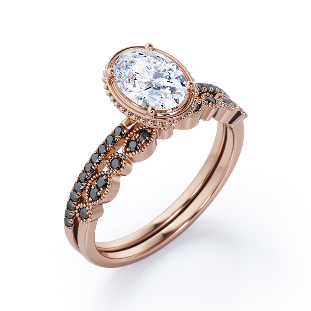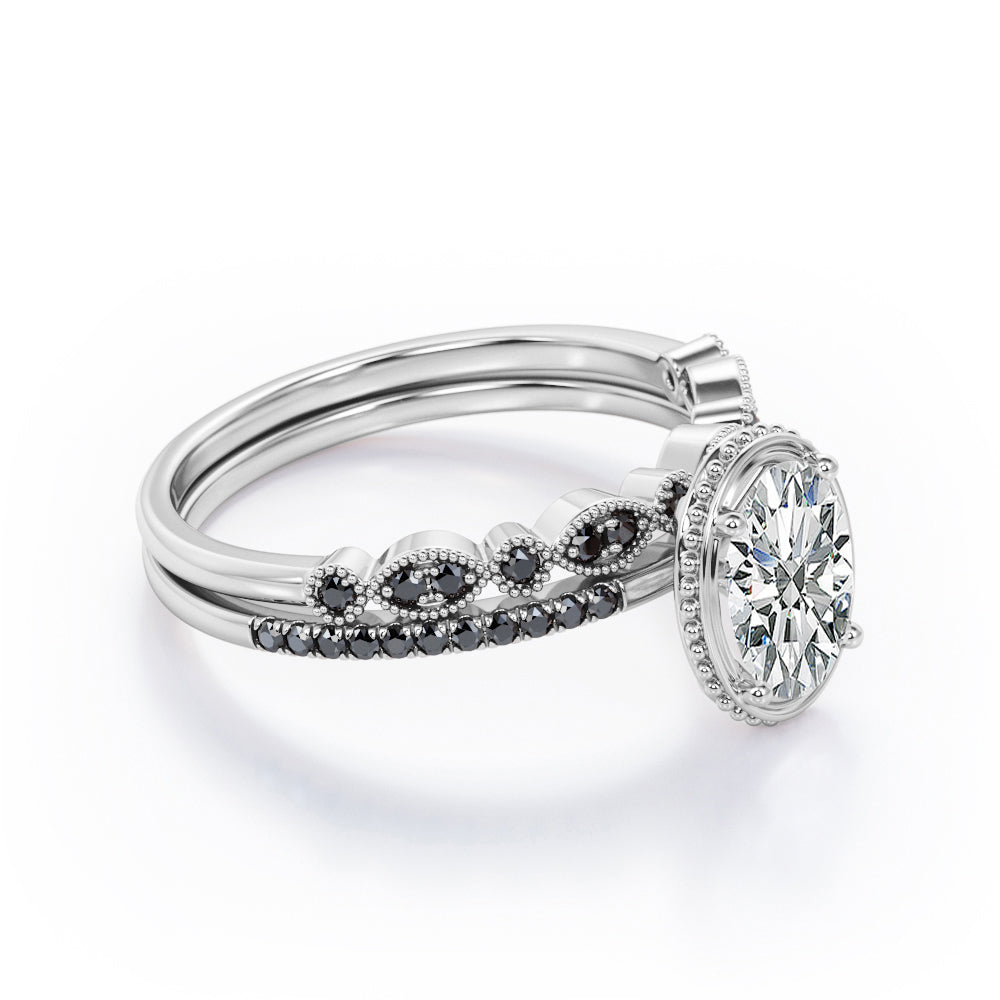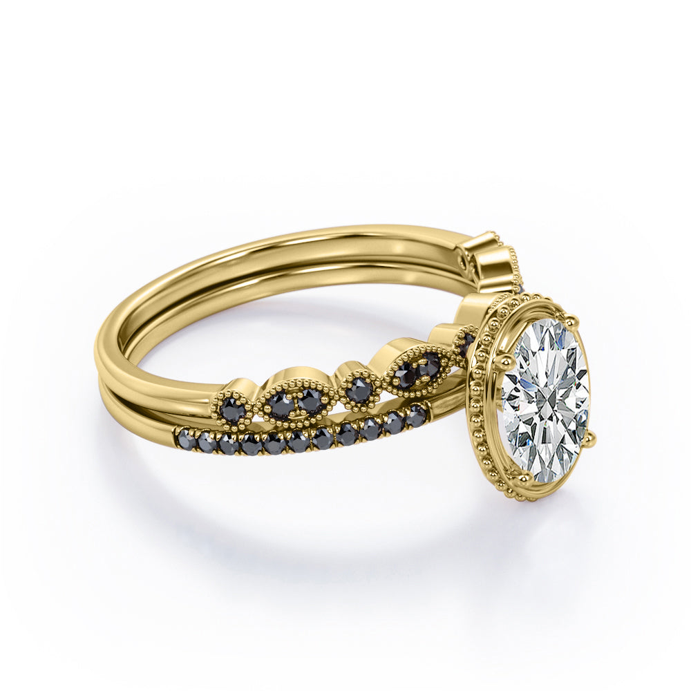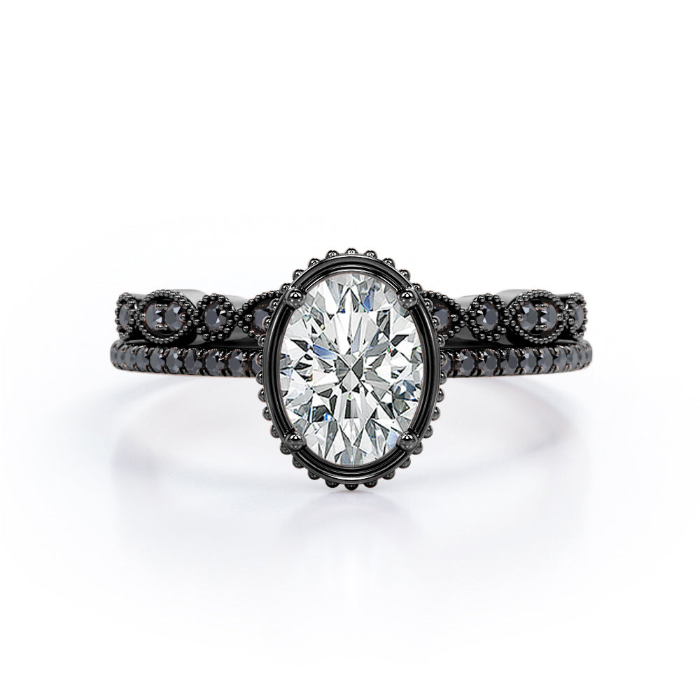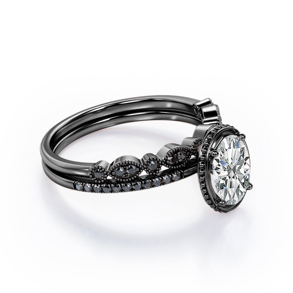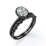 Prong Milgrain Bezel - 1.65 TCW Oval Shaped Moissanite with Lab Created Black Diamond - Pave Filigree Bridal Set in Black Gold