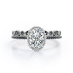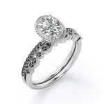 Capture your eternal love with this Prong Milgrain Bezel - 1.65 TCW Oval Shaped Moissanite with Lab Created Black Diamond - Pave Filigree Bridal Set in Black gold. Professionally handcrafted into a fine oval cut by our experts in lapidary, this wonderful moissanite bridal set combines total 1.65 carat moissanite and lab-created black diamonds. Special and non-traditional, this moissanite sterling silver rings set is perfect for those who would love to express their charisma and uniqueness. With naked eyes moissanites look, shine and feel exactly like diamonds. With its glory and clarity, this moissanite stone engagement rings set will absolutely enhance every style of its wearer. This moissanite wedding set is beautiful and accessible since it is available at an affordable price. Moissanites are the most popular alternative gemstone for diamonds while being at lower and more affordable price. Considered as a symbol of timeless love and affection for your lover, this white moissanite ring set, the birthstone ring for the fourth month, symbolizing an unbreakable love and strength, will surely be the best choice. Also, this near colorless moissanite engagement rings set can be customized, so customers can choose one of metal colors between White gold, rose gold, yellow gold and black gold in 18k Gold over Silver, 10k and 14k gold metal options. In regards to its hardness, moissanite is almost as hard as diamond which means that it is notably durable. Let’s impress her with this silver moissanite ring set and, surely, she will not regret it.