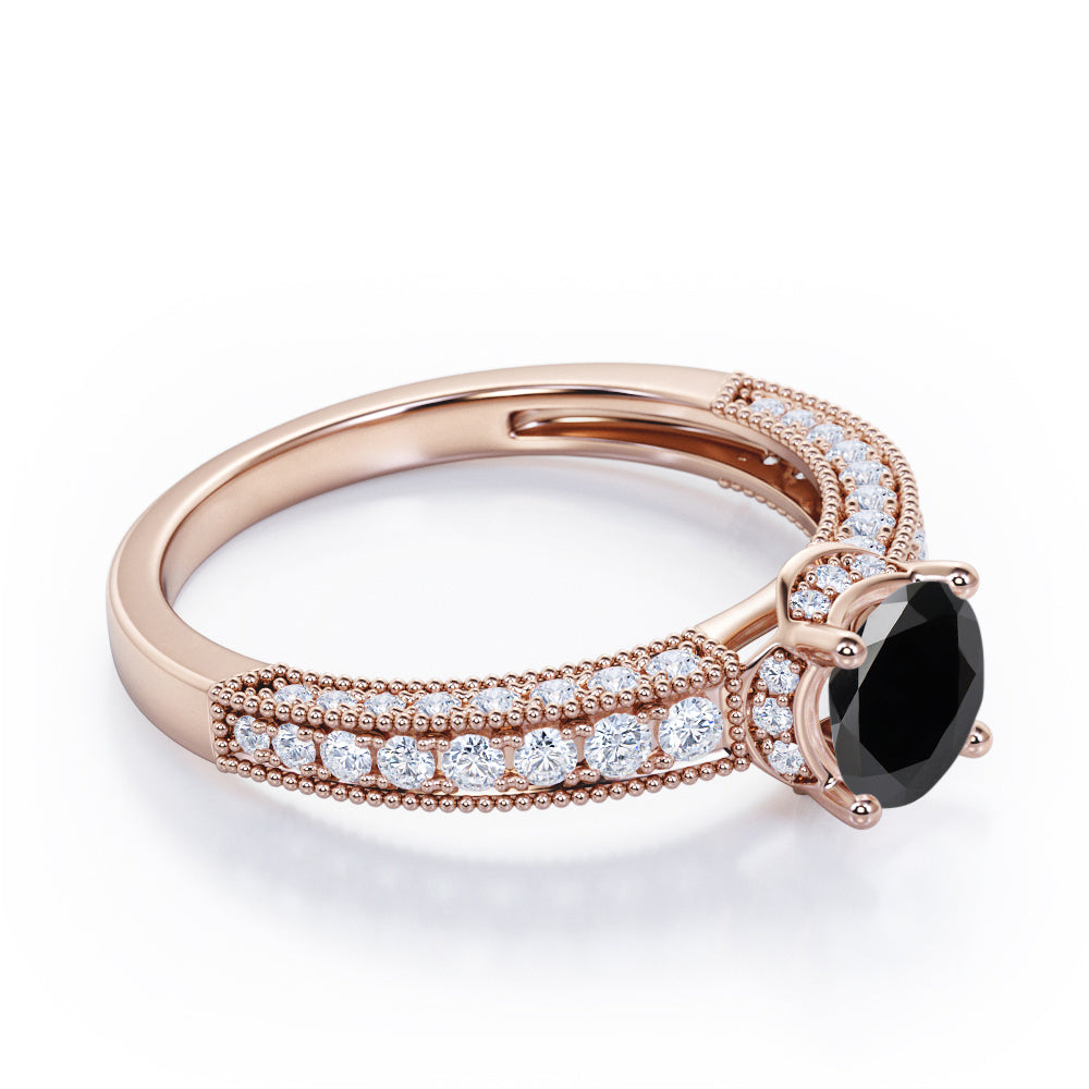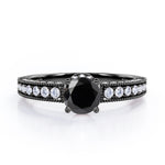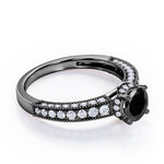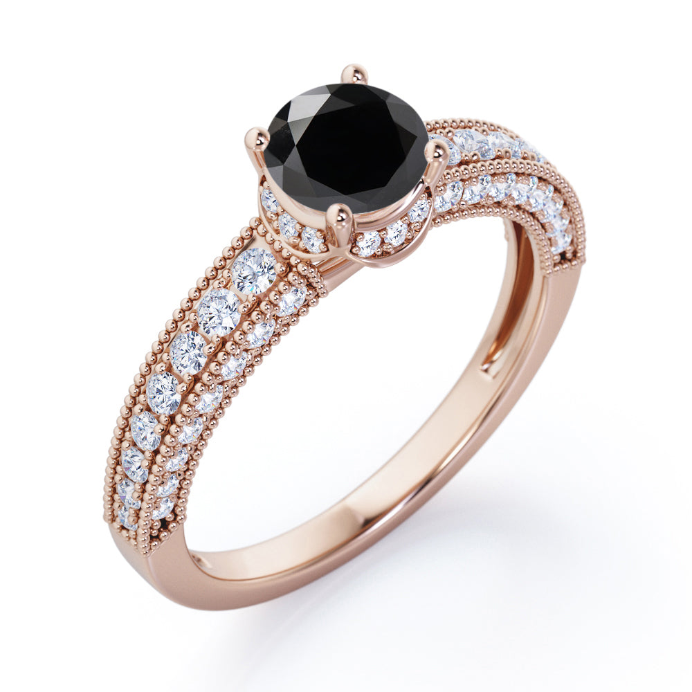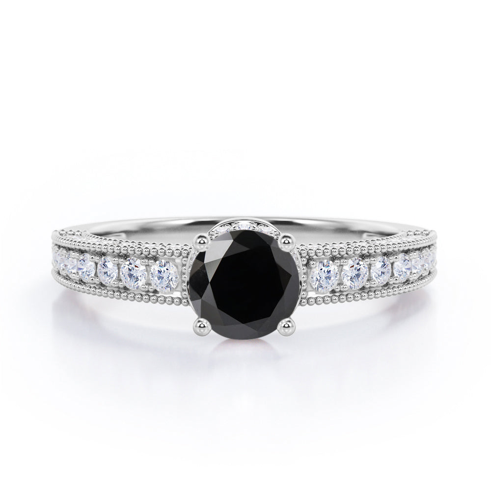 Prong Set 1.45 Carat Round Cut Black Diamond Vintage Milgrain Engagement Ring In White Gold. For the more traditional bride, consider opting for this vintage inspired Black Diamond bridal set for your big day. It is designed to sparkle for a lifetime. With milgrain detailing, this beautiful engagement ring sets the stage for your happily ever after. The ring's iridescence is complemented by the sheen of this delicate white gold band. Moreover, the art deco work with milgrain detail just exudes vintage drama. The natural black diamond is held firmly by the four prongs and the vintage milgrain work all over the edges is highly commendable job of our experienced craftsmen. This alluring engagement ring features 1 carat black diamond as the center stone and 0.45 carat side white diamonds to complete your ensemble. Handmade with utmost love and detailed attention, this prong set 1.45 carat round cut black diamond vintage milgrain engagement ring in white gold can also be customized to 10k Gold, 14k Gold as per your preference.