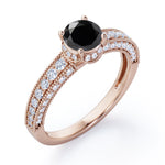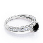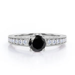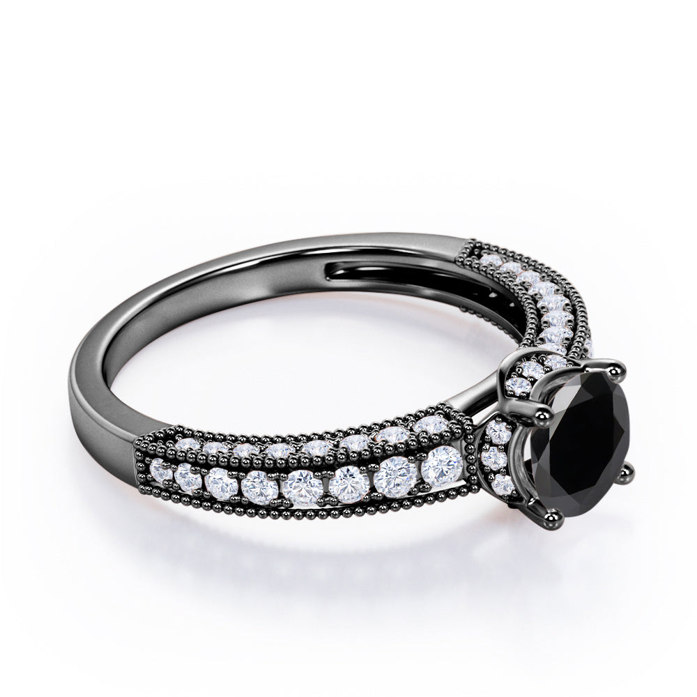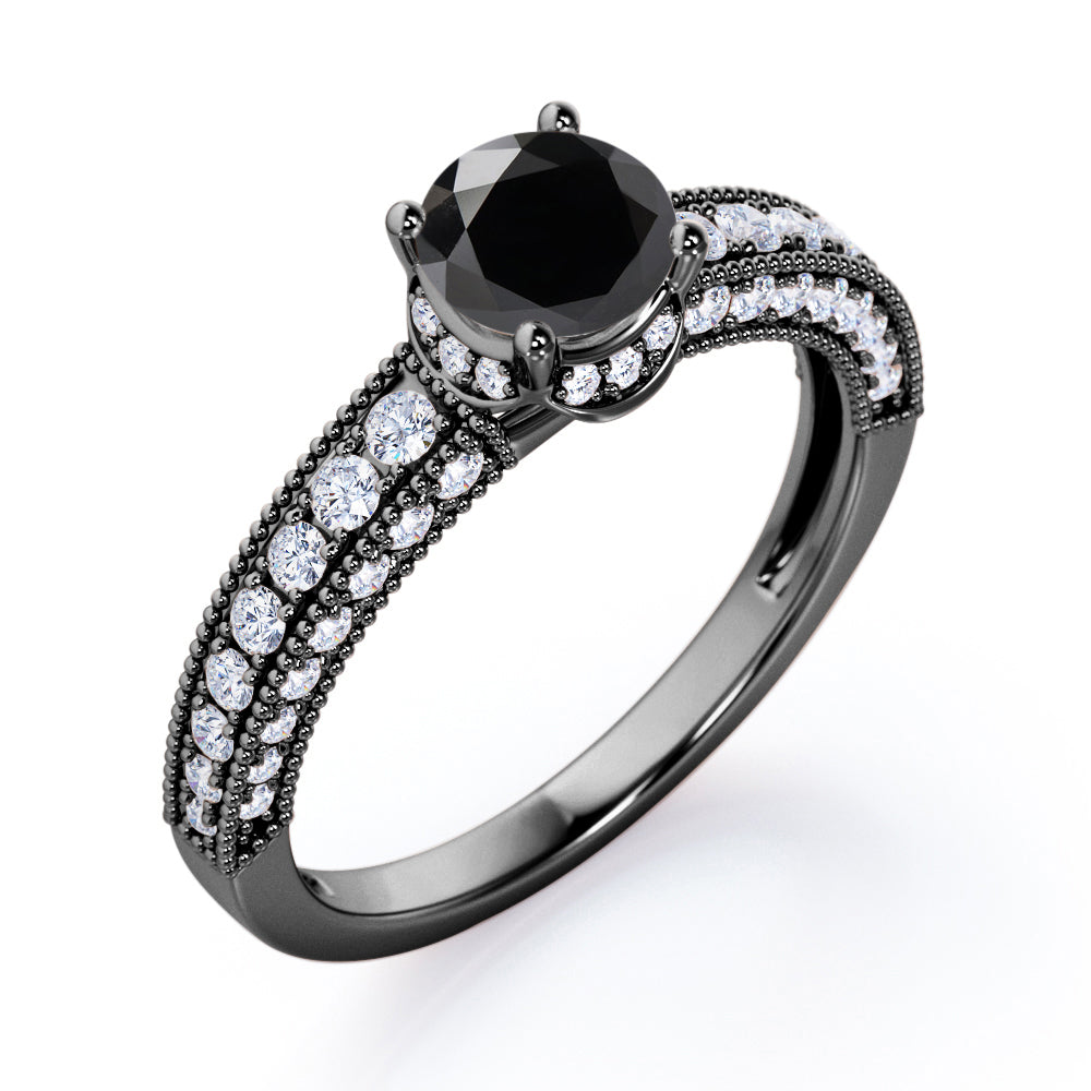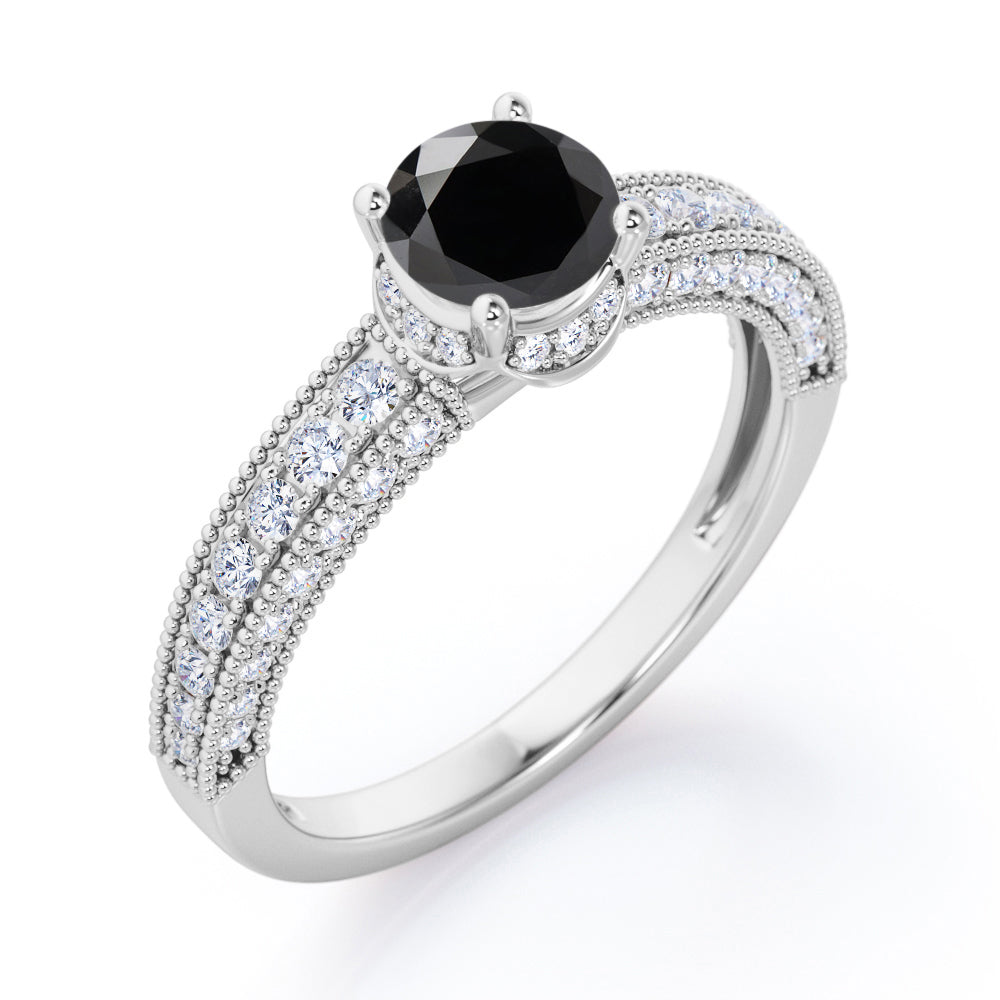 Prong Set 1.45 Carat Round Cut Black Diamond Vintage Milgrain Engagement Ring In White Gold