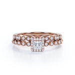 Let the Rope Design Milgrain 0.8 carat Princess Moissanite and Diamond Bridal Set in White Gold complete your special moment. The engagement ring displays a 0.5 carat square cut and surrounded by paved round halo. The band features marquise shape with round Moissanite inside by half of the band. Milgrain goes by the edges and intertwined like a twisted rope. Bead decoration continues to the wedding band but instead of bordering just the marquise shape it frames the round Moissanite as well. The wedding ring set can be purchased in 18k gold over silver, 10k gold, 14k gold with the color of white gold, rose gold, yellow gold and black gold.