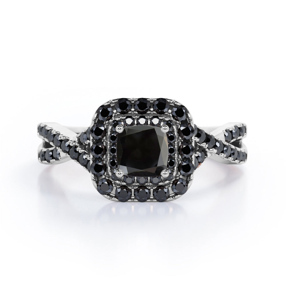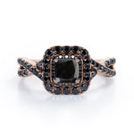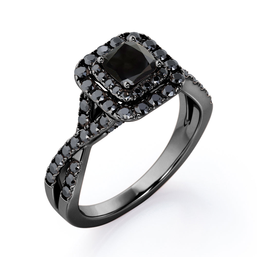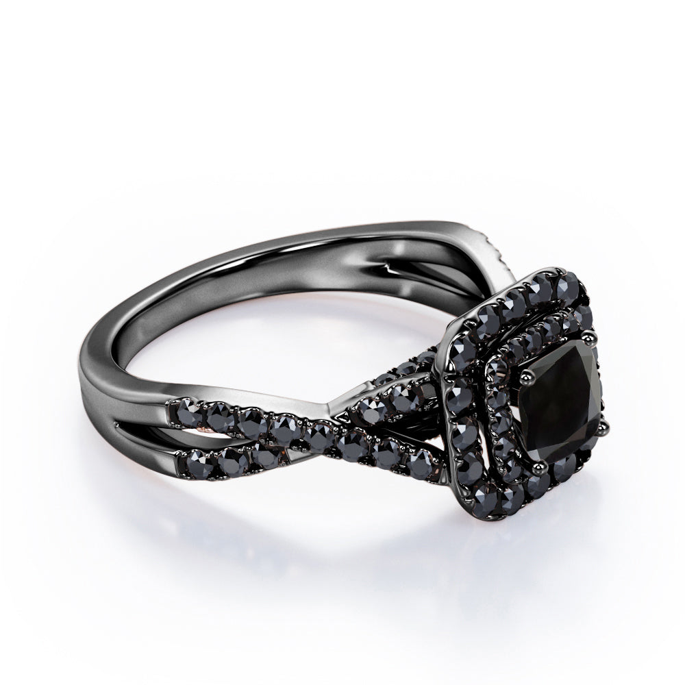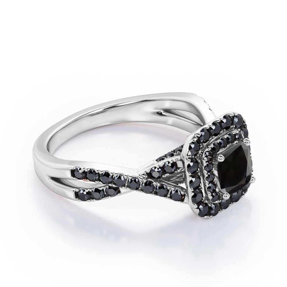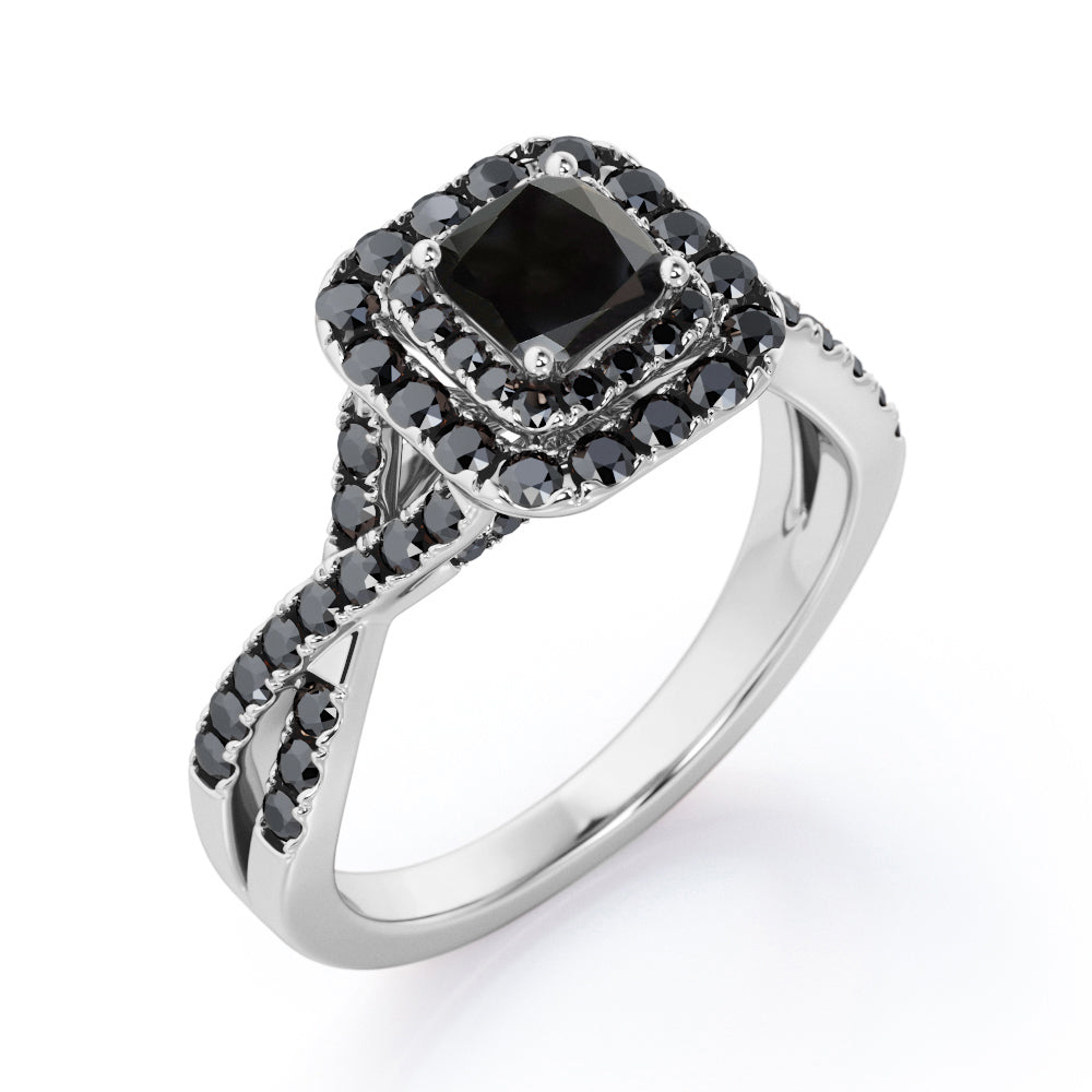 Capture your eternal love with this Rounded Square Double Halo - 1.55 TCW Princess Cut Lab Created Black Diamond - Infinity Pave Engagement Ring in White Gold. Professionally handcrafted into a fine princess cut by our experts in lapidary, this flawless black diamond jewelry consists of total 1.55 carat lab created black diamond on solid white gold. Distinctive and extraordinary, this black diamond ring is perfect for those who would love to express their charisma and uniqueness. Reflective properties of this black diamond stone ring will absolutely enhance every style of its wearer. This black diamond ring is beautiful and accessible since it is available at a reasonable price. If you are in search of an incredibly romantic gift for your significant other, our black diamond ring, symbolizing good luck, love, and creativity, will surely be the best choice. Also, this black diamond stone engagement ring can be customized, either in white gold, rose gold, yellow gold or black gold in 10k and 14k gold metal options upon customer request. Let's fulfill your love story with this black diamond gemstone ring and, surely, she will not regret it.