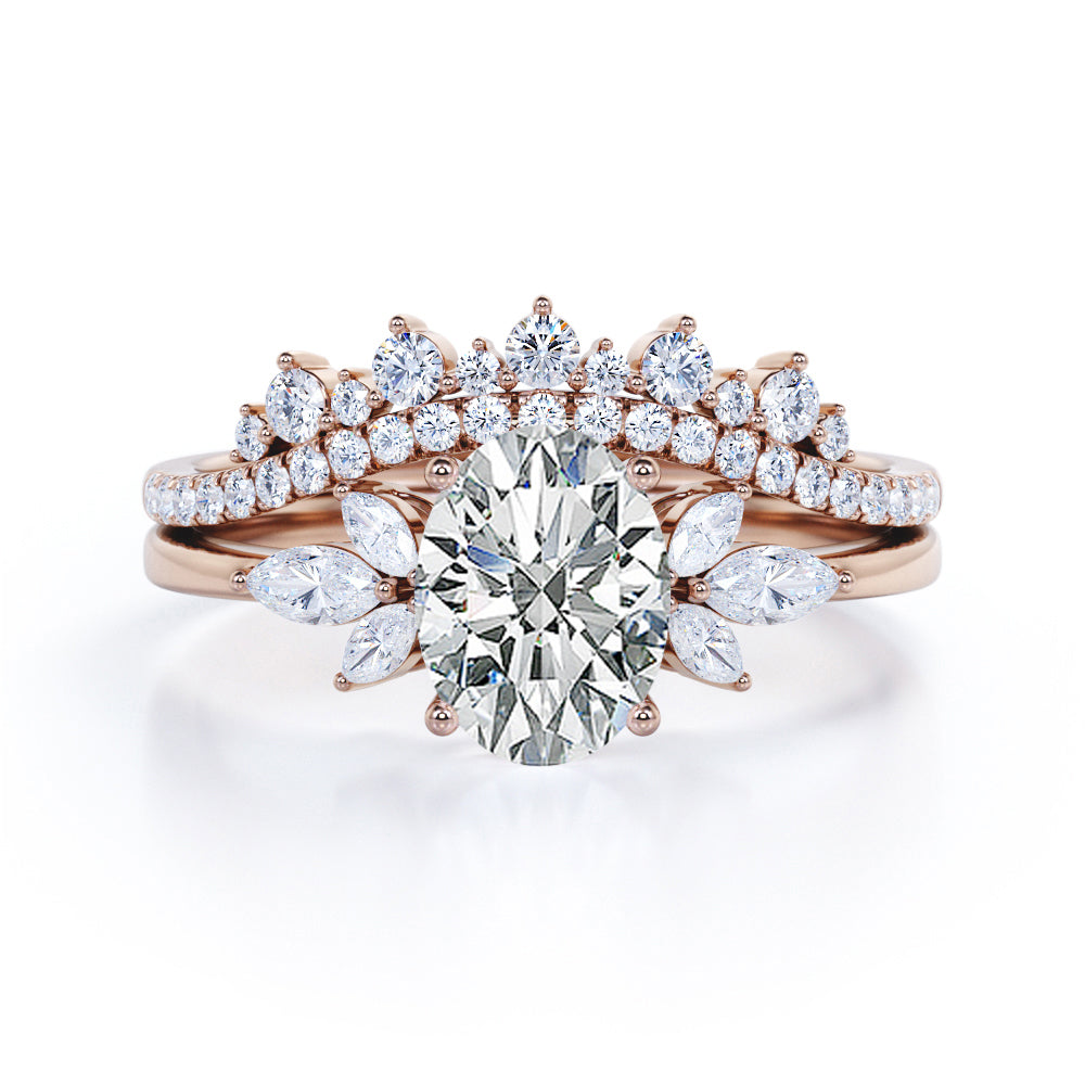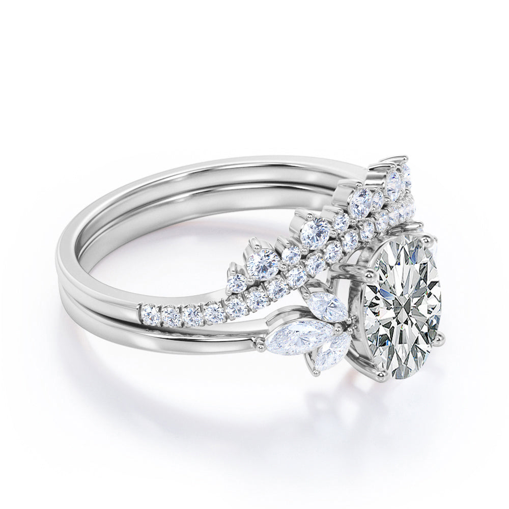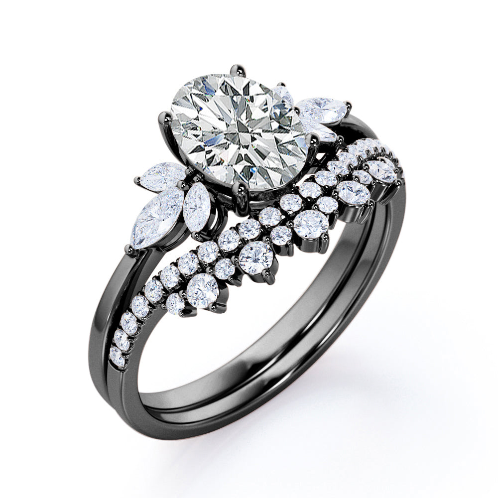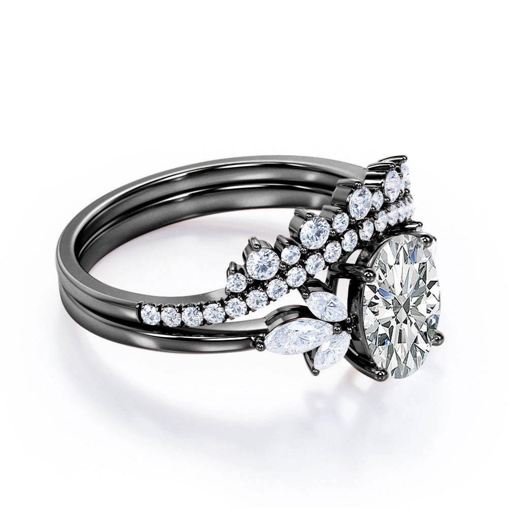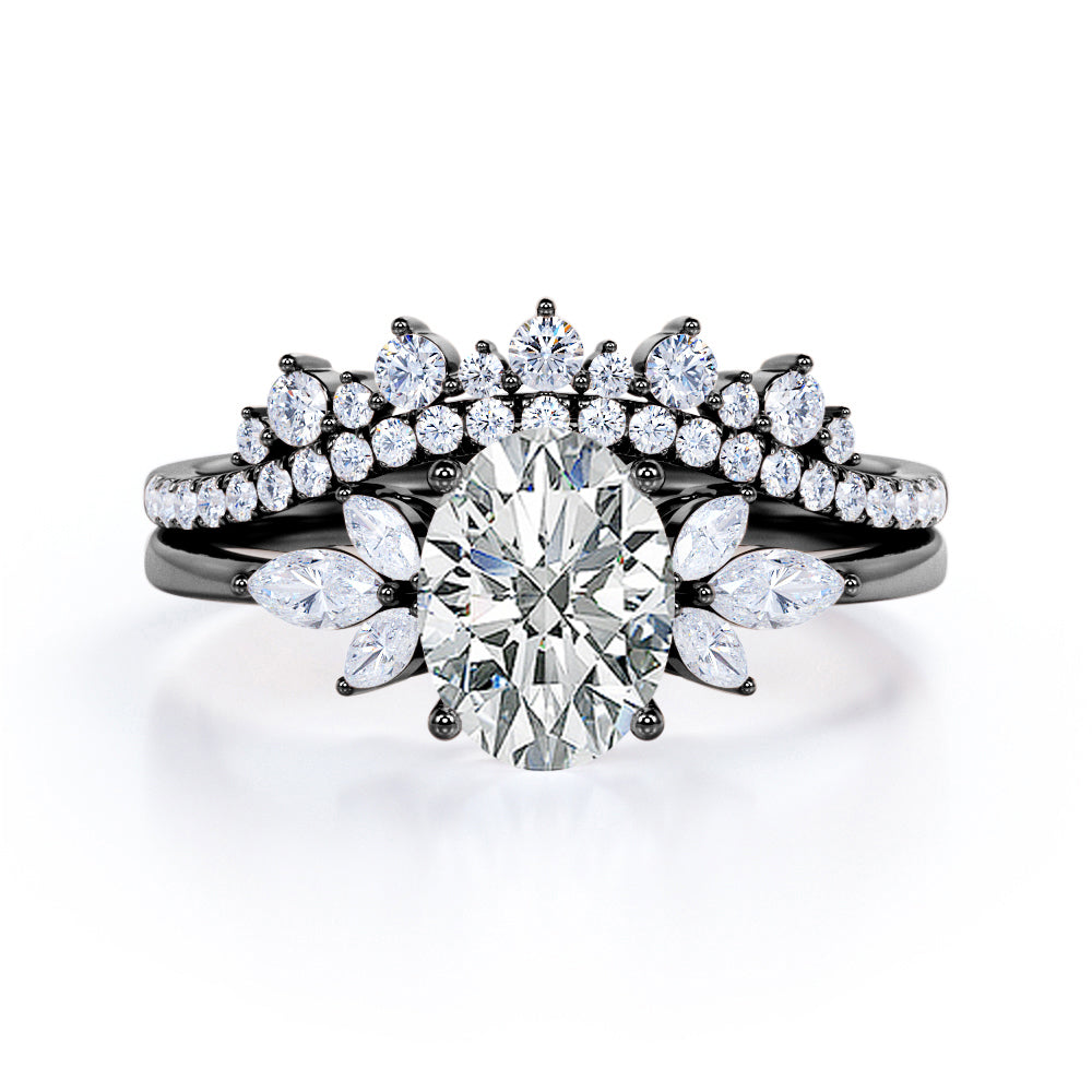 Create an extravagant look with the Royal Inspired 1 carat Oval Moissanite and Diamond Bridal Ring Set in White Gold. The wedding set contains a seven stone engagement ring and double curved wedding band. The 7 stones ring possesses a 0.5 carat oval cut Moissanite in the middle and decorated by marquise Moissanite at the sides. Comes matching with the promise ring is a contoured wedding band where it showcases paved round Moissanite with more decorations on top; round Moissanite is placed above the band alternating the bigger size of round Moissanite. The ring can be purchased at a very affordable price with the color of white gold , rose gold, yellow gold and black gold with the metal options of 18k gold over silver, 10k gold and 14k gold.