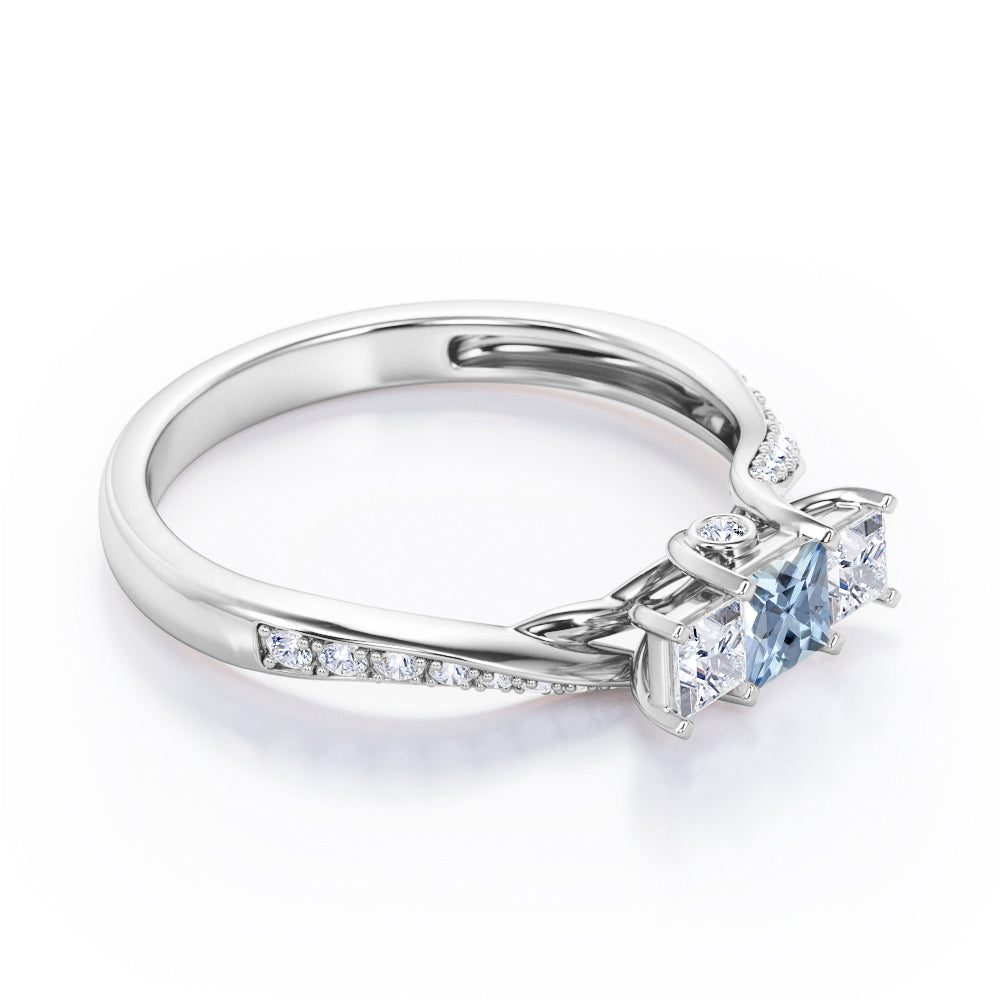 Neat and elegant. A Scale Bridge Accent 0.65 carat Princess Moissanite and Diamond Twisted Wave Engagement Ring in Rose Gold. The ring showcases three stones that are surely the start of this jewelry piece; a 0.5 carat square Aquamarine is placed amidst other two square Moissanite stones. These three brilliant princess cut Aquamarine and Moissanite are elevated in bridge accent setting where a dainty round Moissanite connect the band and center piece together. Once you look at the ring from the side, it will look like a scale that holds semi precious gemstone for your lover. Half of the band id twisted and garnished by paved round Moissanite. This unique ring comes at a very affordable price with the metal options of 18k gold over silver, 10k gold and 14k gold with the color of white gold, rose gold, yellow gold and black gold.