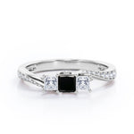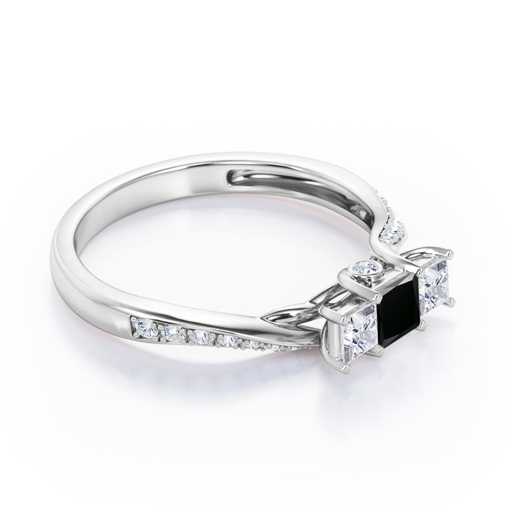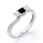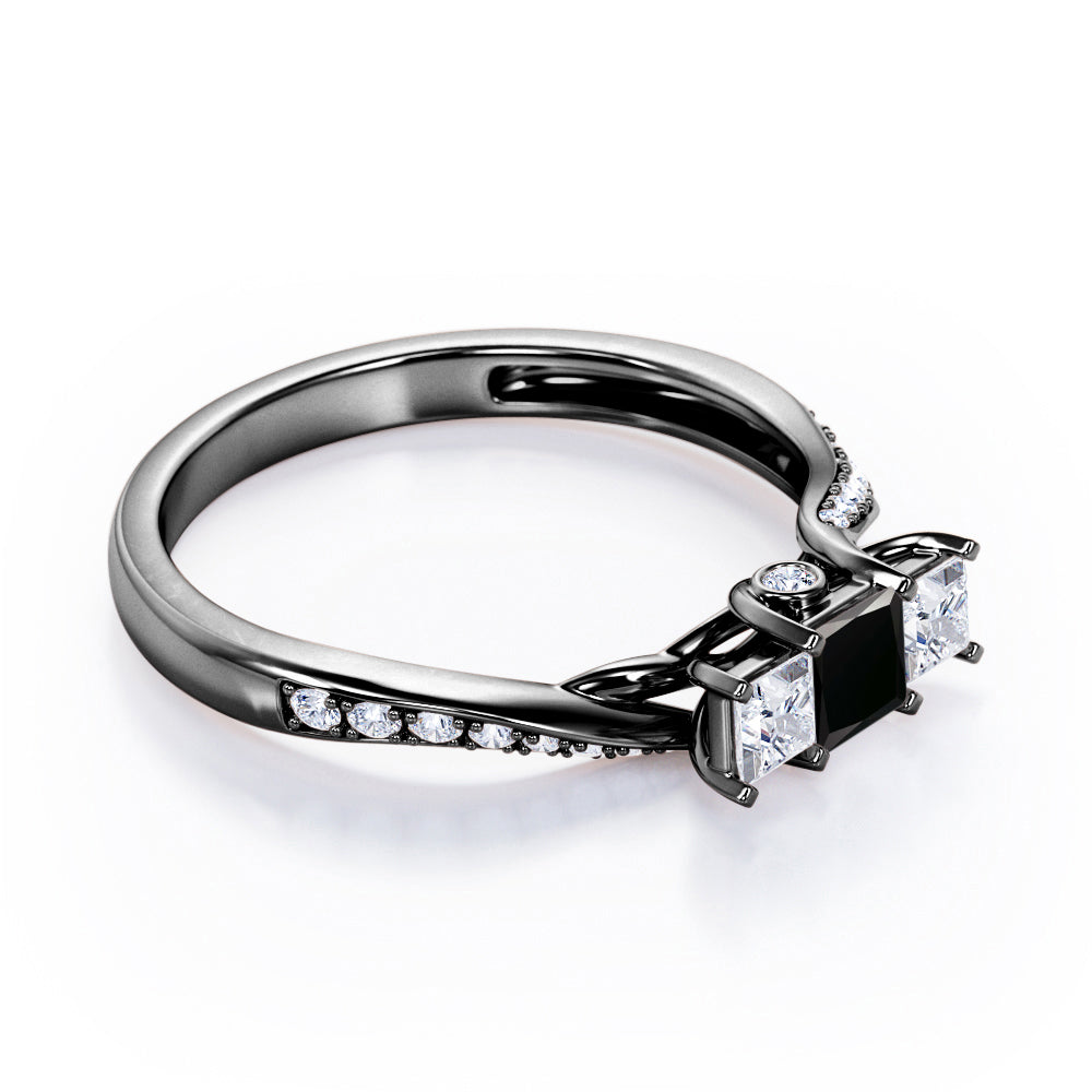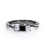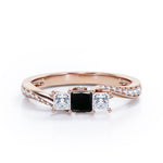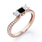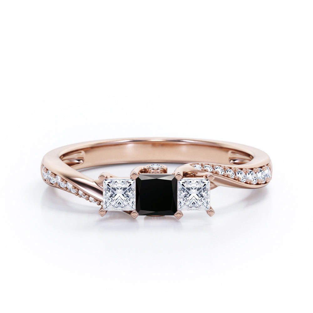Neat and elegant. A Scale Bridge Accent 0.65 carat Princess Black diamond Twisted Wave Engagement Ring in Rose Gold. The ring showcases three stones that are surely the start of this jewelry piece; a 0.5 carat square Black diamond is placed amidst other two square Moissanite stones. These three brilliant princess cut Black diamond and Moissanite are elevated in bridge accent setting where a dainty round Moissanite connect the band and center piece together. Once you look at the ring from the side, it will look like a scale that holds semi precious gemstone for your lover. Half of the band id twisted and garnished by paved round Moissanite. This unique ring comes at a very affordable price with the metal options of 18k gold over silver, 10k gold and 14k gold with the color of white gold, rose gold, yellow gold and black gold.