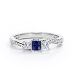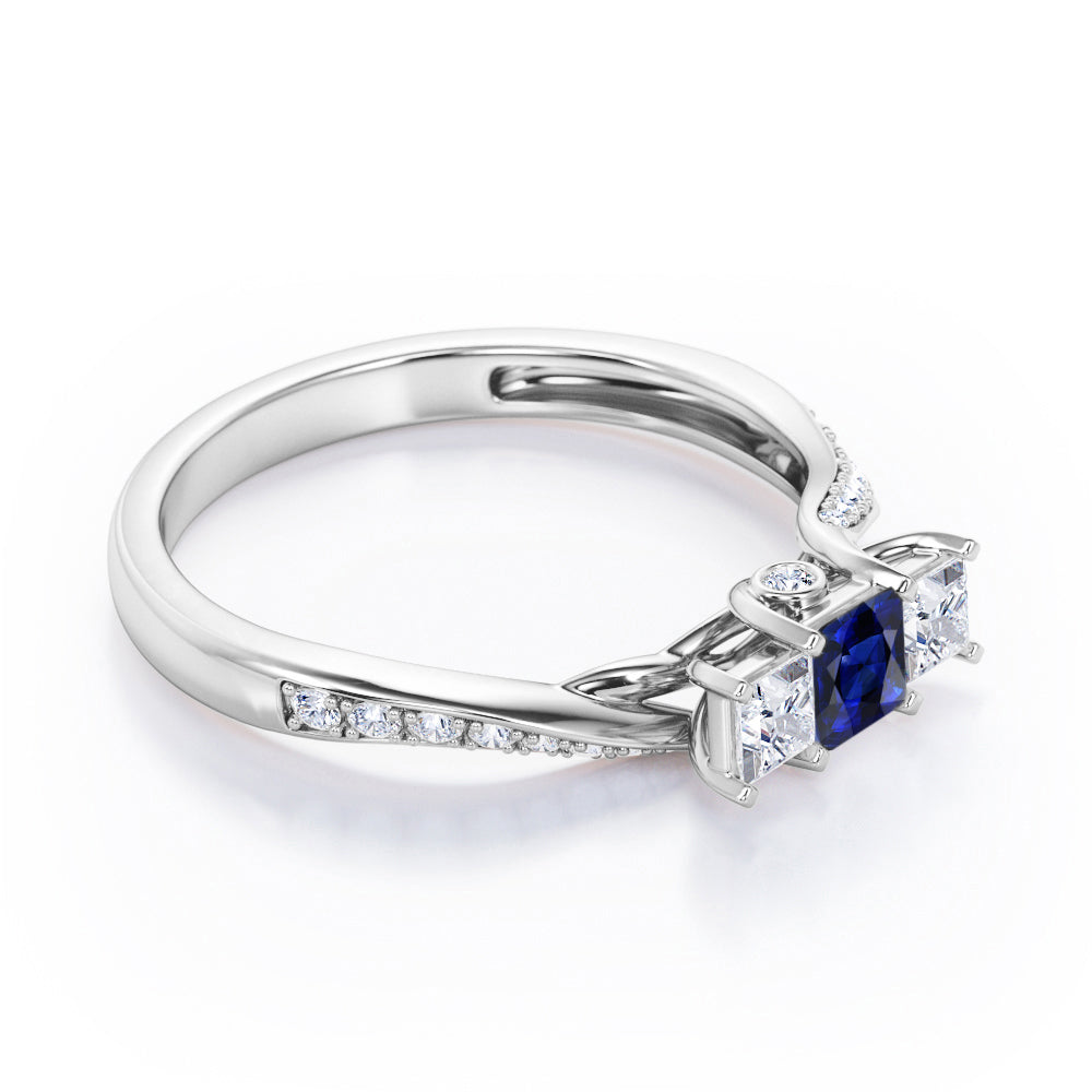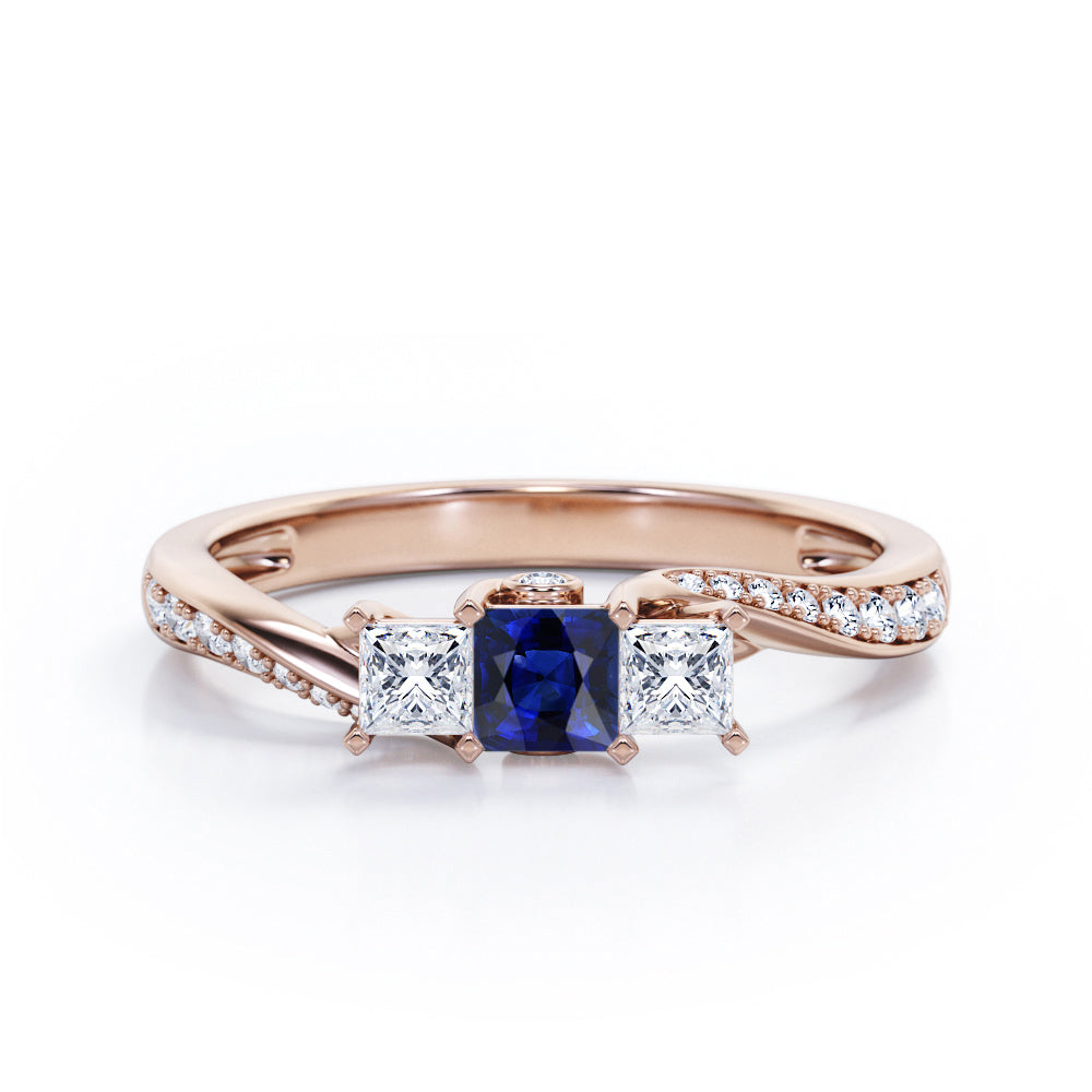 Neat and elegant. A Scale Bridge Accent 0.65 carat Princess Moissanite and Diamond Twisted Wave Engagement Ring in Rose Gold. The ring showcases three stones that are surely the start of this jewelry piece; a 0.5 carat square Blue Sapphire is placed amidst other two square Moissanite stones. These three brilliant princess cut Blue Sapphire and Moissanite are elevated in bridge accent setting where a dainty round Moissanite connect the band and center piece together. Once you look at the ring from the side, it will look like a scale that holds semi precious gemstone for your lover. Half of the band id twisted and garnished by paved round Moissanite. This unique ring comes at a very affordable price with the metal options of 18k gold over silver, 10k gold and 14k gold with the color of white gold, rose gold, yellow gold and black gold.