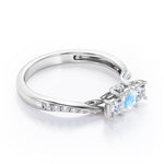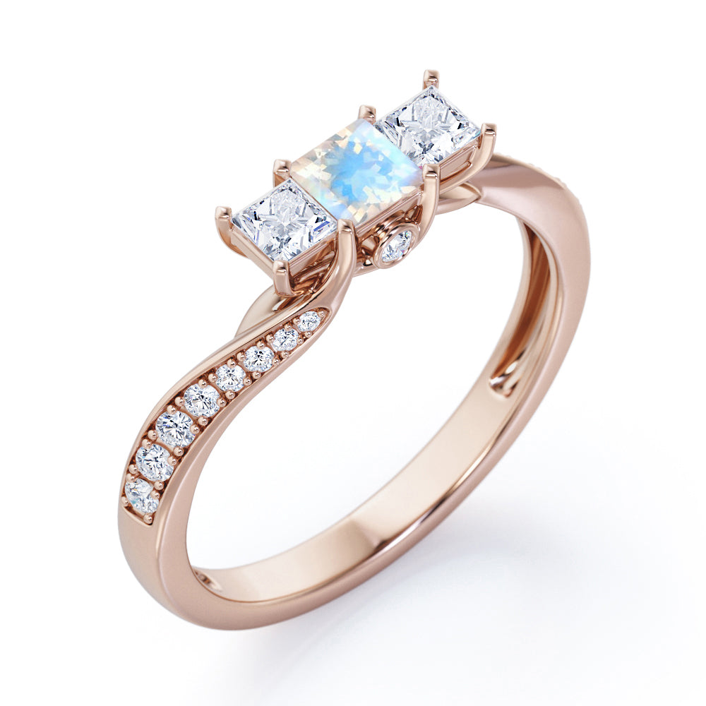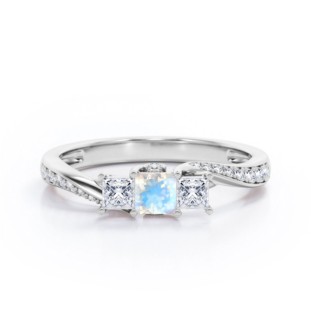 Neat and elegant. A Scale Bridge Accent 0.65 carat Princess Moissanite and Diamond Twisted Wave Engagement Ring in White Gold. The ring showcases three stones that are surely the start of this jewelry piece; a 0.5 carat square Moonstone is placed amidst other two square Moissanite stones. These three brilliant princess cut Moonstone and Moissanite are elevated in bridge accent setting where a dainty round Moissanite connect the band and center piece together. Once you look at the ring from the side, it will look like a scale that holds semi precious gemstone for your lover. Half of the band id twisted and garnished by paved round Moissanite. This unique ring comes at a very affordable price with the metal options of 18k gold over silver, 10k gold and 14k gold with the color of white gold, rose gold, yellow gold and black gold.