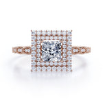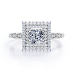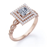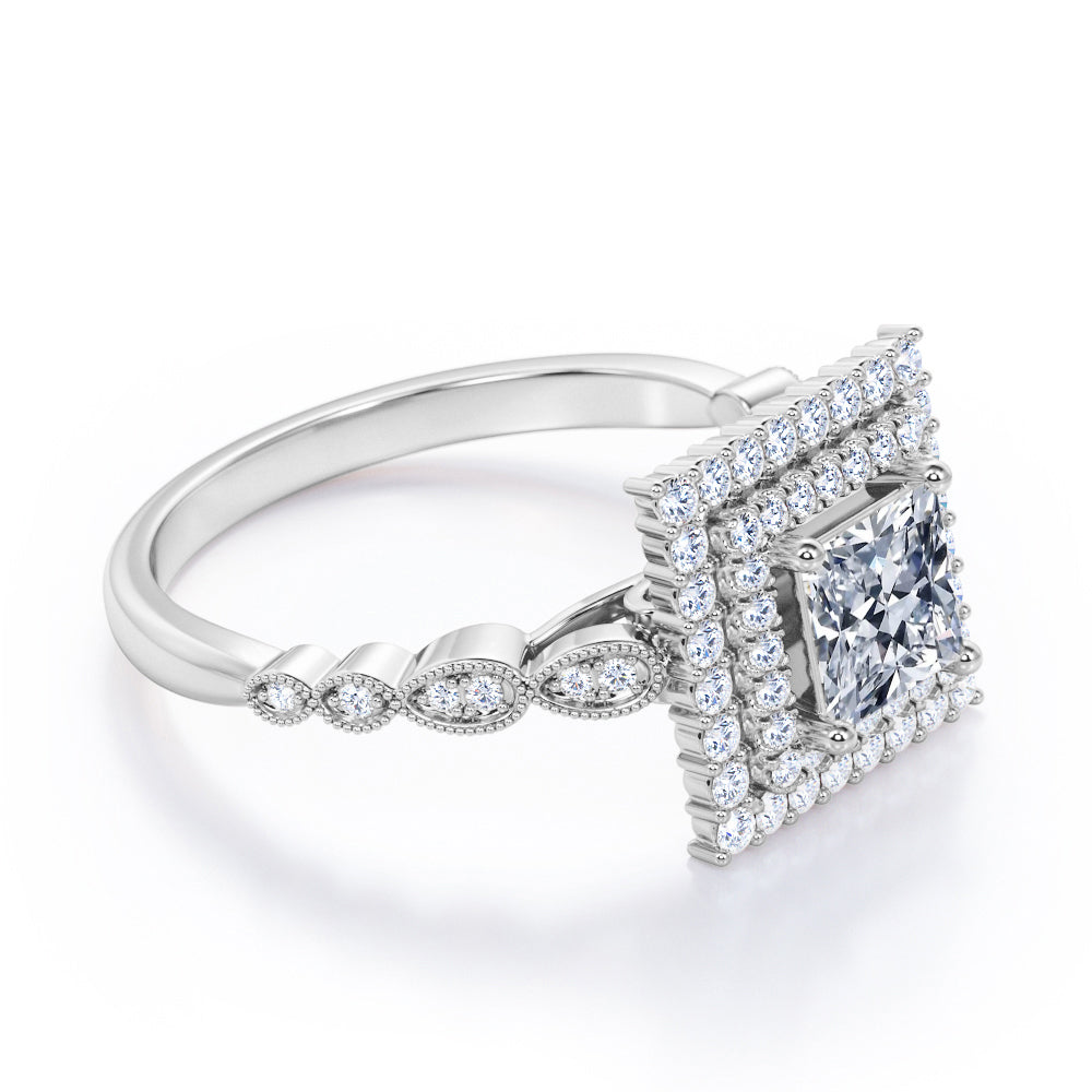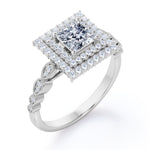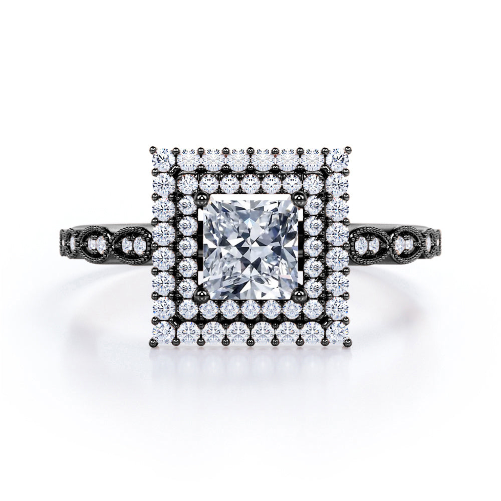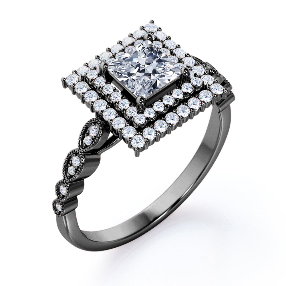 One Stone might note be enough so why not surprising her with the Scalloped 1.1 carat Princess Cut Moissanite and Diamond Engagement Ring in Black Gold. The promise ring boasts a 0.5 carat square Moissanite that is set among Moissanite double halo. Petite round Moissanite create a visual illusion and makes the center stone looks bigger and shines brighter. The band is made into marquise shape by half of it and each one is filled by dainty round Moissanite and edged by Milgrain decoration. You can choose the color either white gold, rose gold, yellow gold or black gold. Each color will give you a different feeling and you can also choose the metal of your ring. White gold, rose gold, yellow gold and black gold are up for you to choose.