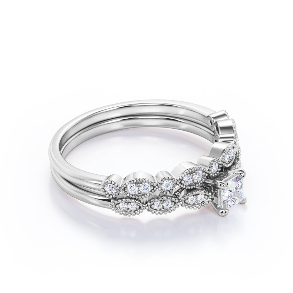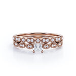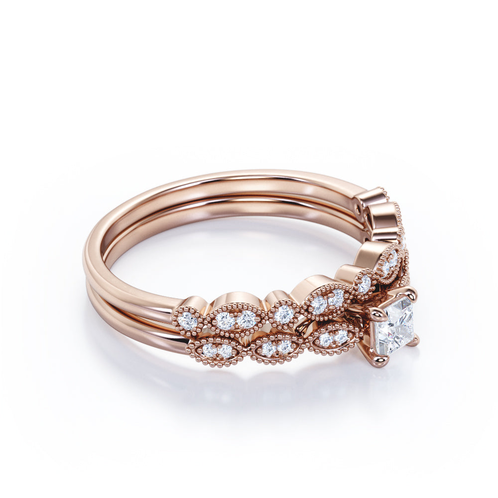 Scalloped Bead Décor 0.7 carat Princess Moissanite and diamond wedding Ring Set in Rose Gold