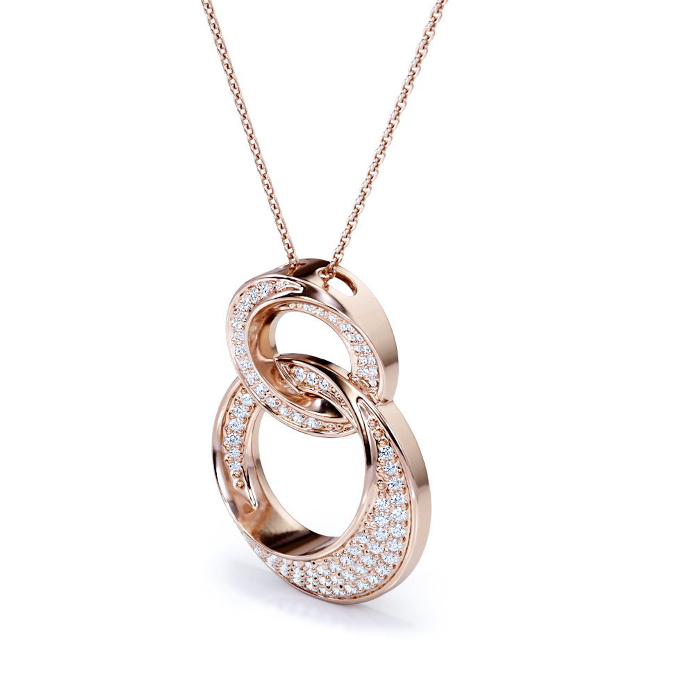 Scalloped Micro Pave Set 0.30 Carat Round Cut Moissanite Infinity Wave Pendant Necklace In Rose Gold. Celebrate your love life with this stunning necklace. Crafted in rose gold, the pendant necklace shows unique and pristine beauty with its exquisite workmanship. The surface of the pendant is sculptured in a wave of infinity surrounded by intertwined carvings. This can be the best gift of love for Mom, wife, children or yourself. Never miss it! Show your infinite love to your special ones with this infinity style eye-catching necklace. This scalloped micro pave set 0.30 carat round cut moissanite infinity wave pendant necklace in rose gold can also be customized into 18k Gold plating over silver, 10k Gold or 14k Gold as per your preference.