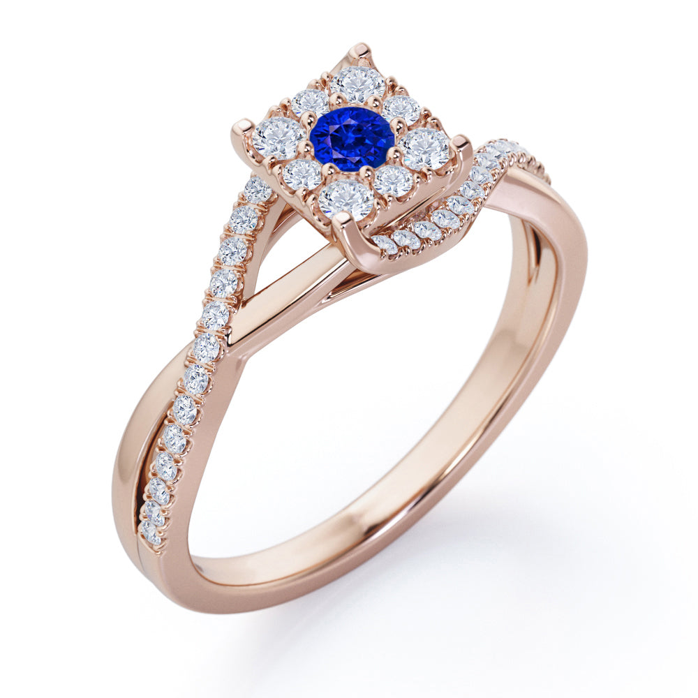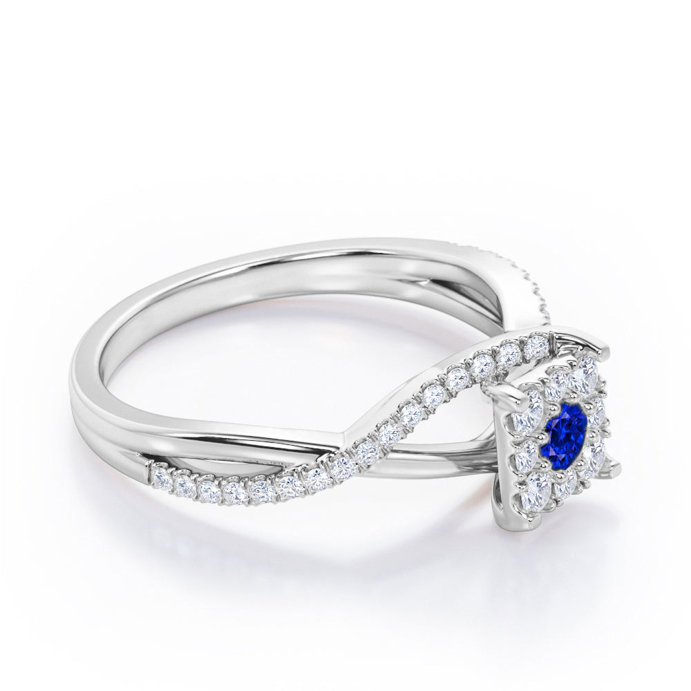 With this Semi Twisted Infinity 0.9 Carat Round Shape Blue Sapphire and diamond Square Floral Cluster in White Gold, you can begin the most romantic chapter of your life. Handcrafted with care into a wonderful round cut by our lapidary expertise, this gorgeous Blue Sapphire engagement ring showcases a natural 0.5 carat Blue Sapphire stone in the center with 0.4 carat diamond side stones for a total carat weight of 0.9 carat. For those looking for something a little out of the ordinary, this engagement ring for women is an excellent choice. This cheap Blue Sapphire engagement ring will bring joy and good energy to its wearer. Beautiful and affordable, this gem engagement ring is stunning and inexpensive, thanks to its reasonable price. This affordable engagement ring for women, the birthstone ring for September, symbolically represents love and dedication, is the best gift you can give to your significant other. Also, this Blue Sapphire ring can be customized, so customers can choose one of metal colors between white gold, rose gold, yellow gold, and black gold. Let's show her how much you care by giving her this Blue Sapphire engagement ring, and she will never regret it.