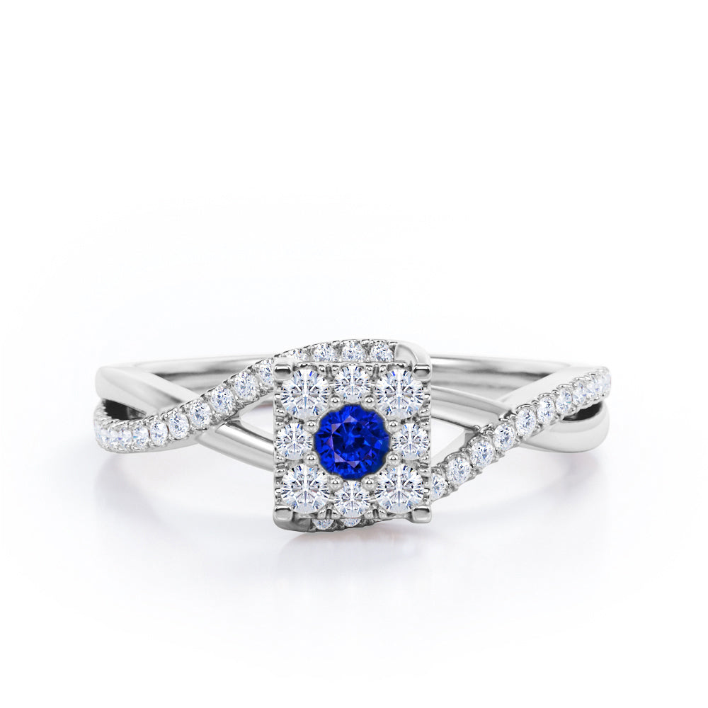 With this Semi Twisted Infinity 0.9 Carat Round Shape Blue Sapphire and diamond Square Floral Cluster in White Gold, you can begin the most romantic chapter of your life. Handcrafted with care into a wonderful round cut by our lapidary expertise, this gorgeous Blue Sapphire engagement ring showcases a natural 0.5 carat Blue Sapphire stone in the center with 0.4 carat diamond side stones for a total carat weight of 0.9 carat. For those looking for something a little out of the ordinary, this engagement ring for women is an excellent choice. This cheap Blue Sapphire engagement ring will bring joy and good energy to its wearer. Beautiful and affordable, this gem engagement ring is stunning and inexpensive, thanks to its reasonable price. This affordable engagement ring for women, the birthstone ring for September, symbolically represents love and dedication, is the best gift you can give to your significant other. Also, this Blue Sapphire ring can be customized, so customers can choose one of metal colors between white gold, rose gold, yellow gold, and black gold. Let's show her how much you care by giving her this Blue Sapphire engagement ring, and she will never regret it.