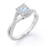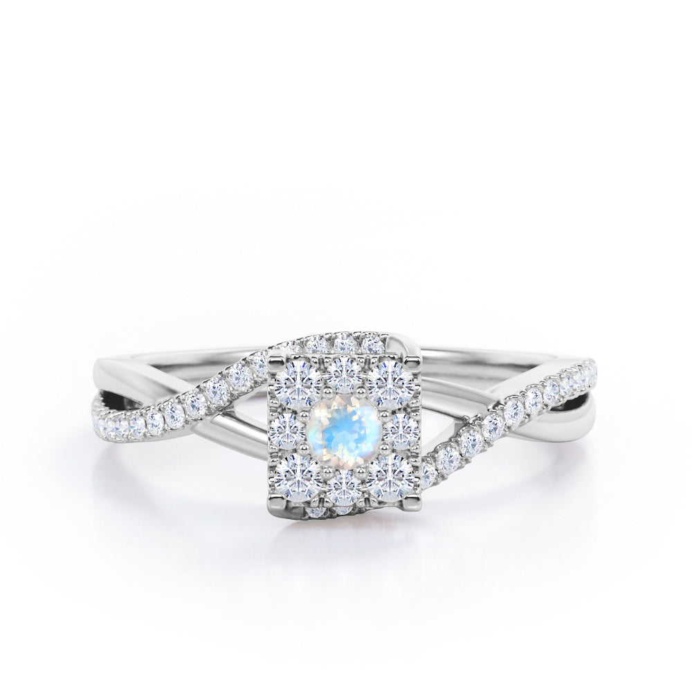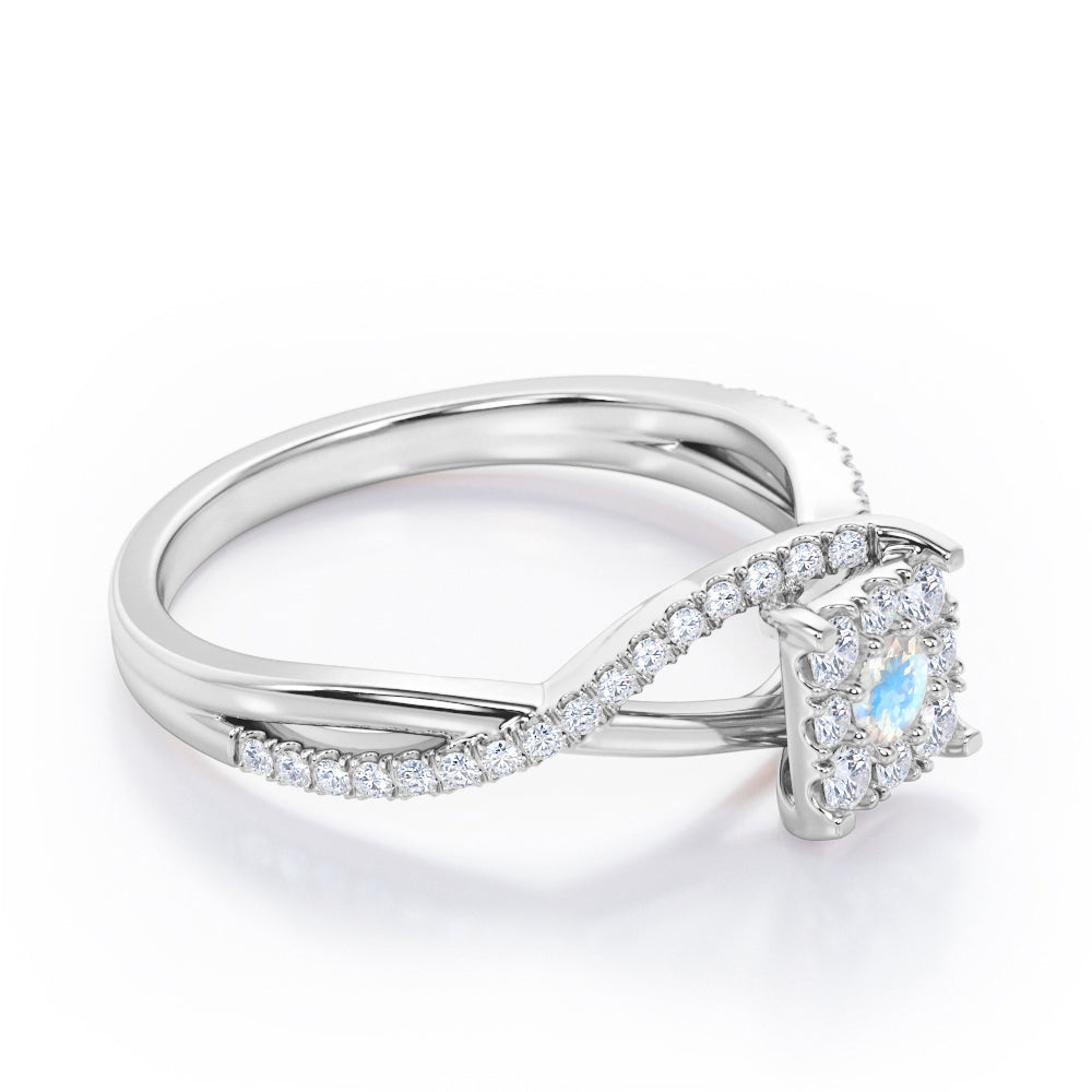 With this Semi Twisted Infinity 0.9 Carat Round Shape Moonstone and diamond Square Floral Cluster in White Gold, you can begin the most romantic chapter of your life. Handcrafted with care into a wonderful round cut by our lapidary expertise, this gorgeous Moonstone engagement ring showcases a natural 0.5 carat Moonstone stone in the center with 0.4 carat diamond side stones for a total carat weight of 0.9 carat. For those looking for something a little out of the ordinary, this engagement ring for women is an excellent choice. This cheap Moonstone engagement ring will bring joy and good energy to its wearer. Beautiful and affordable, this gem engagement ring is stunning and inexpensive, thanks to its reasonable price. This affordable engagement ring for women, the birthstone ring for June, symbolically represents love and dedication, is the best gift you can give to your significant other. Also, this Moonstone ring can be customized, so customers can choose one of metal colors between white gold, rose gold, yellow gold, and black gold. Let's show her how much you care by giving her this Moonstone engagement ring, and she will never regret it.