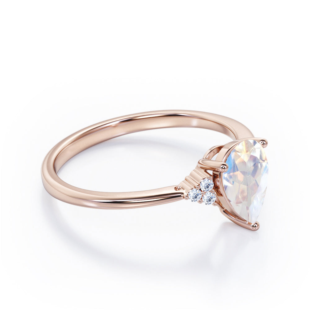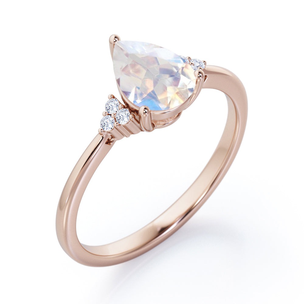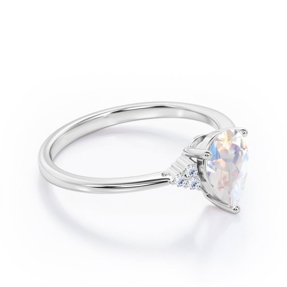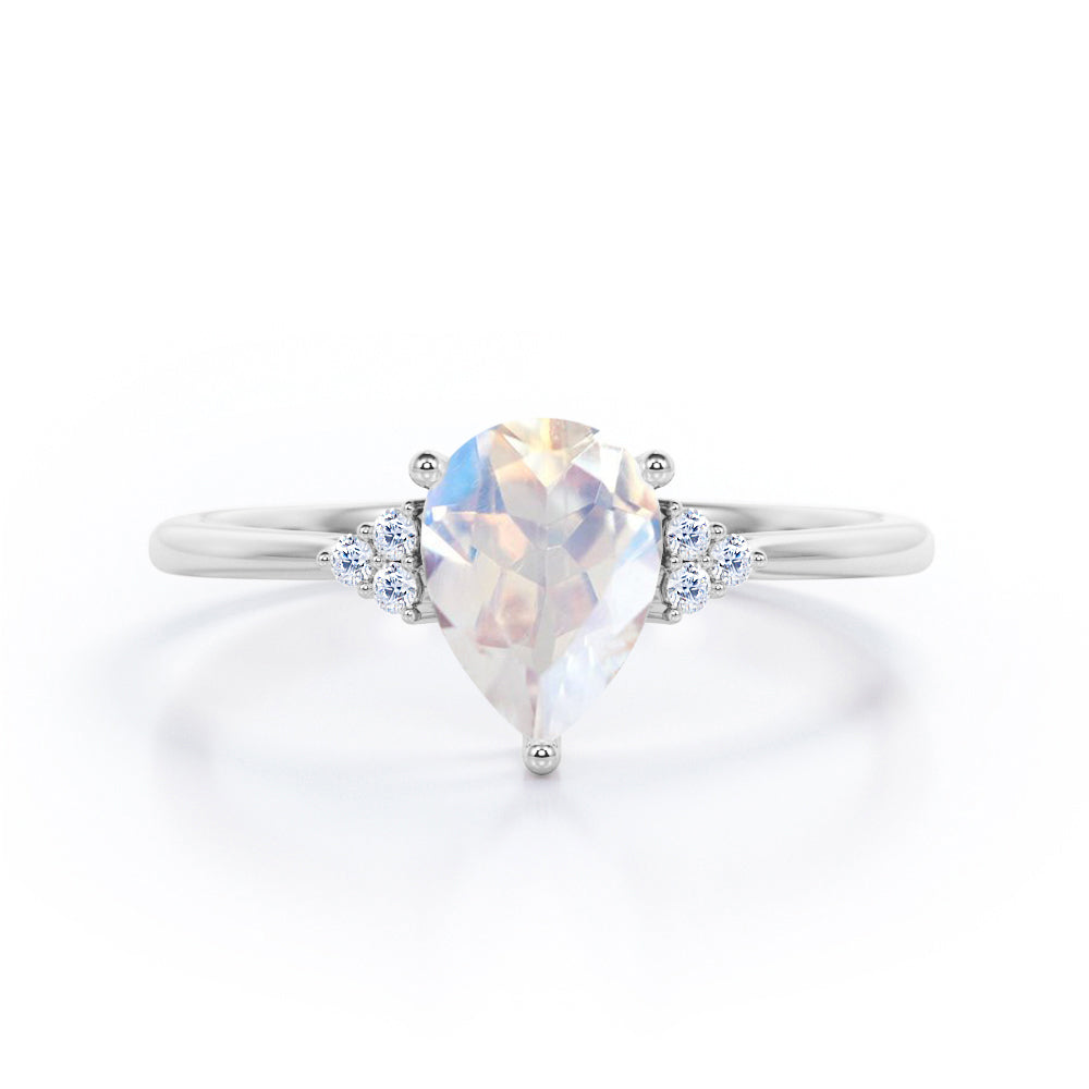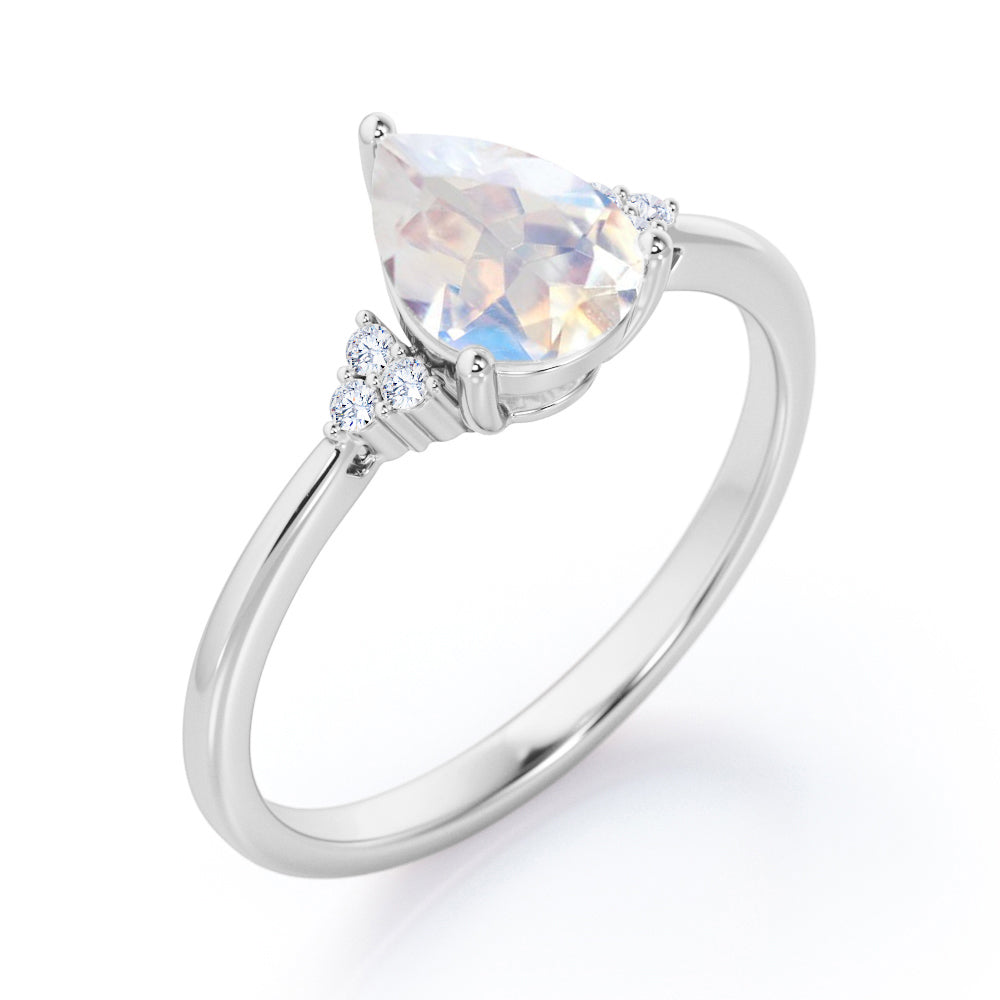 Seven Stone 0.5 carat Pear Moonstone and Diamond Dainty Band Engagement Ring in White Gold displays a 0.5 carat Pear Moonstone in the center and flanked by clustered triangle that is formed with three dainty round diamonds on each side. Some people believe that 7 is a good number that will bring you good luck. Wish your believed one well with this Moonstone and diamond engagement ring that can also become there everyday wear jewelry. The promise ring can be customized to your choice of 18k gold over silver, 10k gold and 14k gold with the color of white gold, rose gold, yellow gold and black gold.