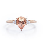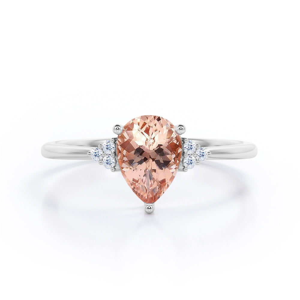 Seven Stone 0.5 carat Pear Morganite and Diamond Dainty Band Engagement Ring in White Gold displays a 0.5 carat Pear Morganite in the center and flanked by clustered triangle that is formed with three dainty round diamonds on each side. Some people believe that 7 is a good number that will bring you good luck. Wish your believed one well with this Morganite and diamond engagement ring that can also become there everyday wear jewelry. The promise ring can be customized to your choice of 18k gold over silver, 10k gold and 14k gold with the color of white gold, rose gold, yellow gold and black gold.