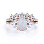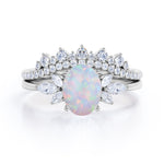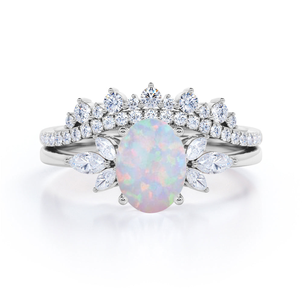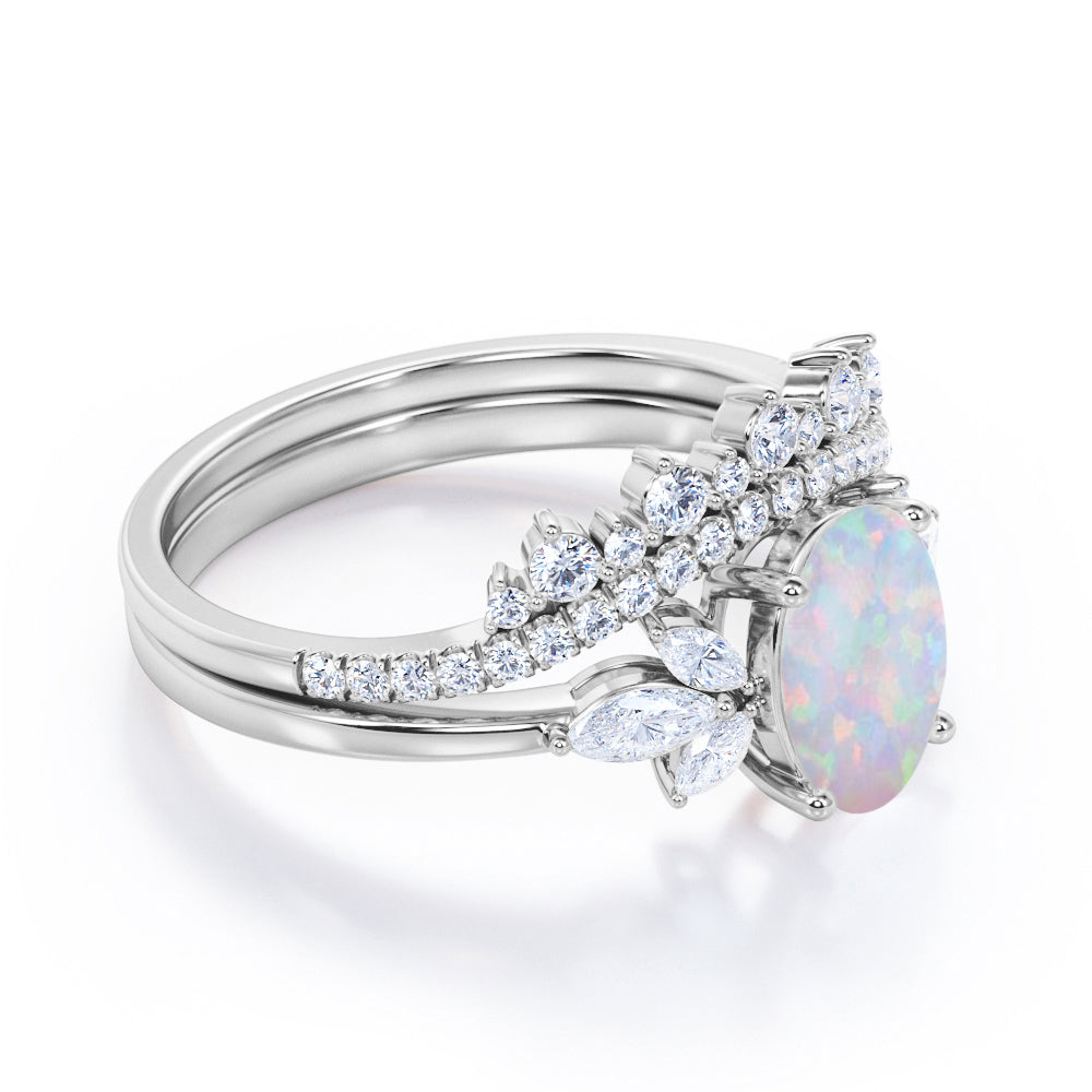 Seven Stone 1.75 Carat Oval Cut Genuine Lab Created Opal And Diamond Leaf Décor Pave Bridal Set In White Gold. Make an impact with this Lab Created Opal and diamond engagement ring that demands attention. A striking oval cut Lab Created Opal center stone diamond is framed by six marquise cut white diamonds on either side. This seven stone wedding ring set features an engagement ring with 1.30 carat Lab Created Opal and 0.45 carat white diamonds inclusive of the matching wedding band. Pave set diamonds sparkle on the white gold band. The four prong holds the solitaire Lab Created Opal stone on a basket setting letting it to shine on its own and the leaf like decor adds just extra elegance to this bridal set. Since all our rings are handmade by our experienced artisans with love and care, this seven stone 1.75 carat oval cut genuine Lab Created Opal and diamond leaf decor pave bridal set in white gold can also be customized to 18k Gold plating over silver, 10k Gold or 14k Gold as you prefer.