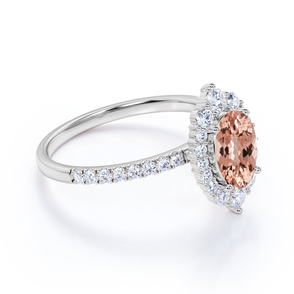 The vintage morganite ring is quite amazing, since majority of us likes to see a vintage look, especially with an engagement ring that is absolutely beautiful. This affordable morganite ring can also be made in rose, white or yellow gold and in 10k, 14k or 18k real solid gold. This morganite ring features an approximately 1 carat oval shaped genuine morganite, surrounded by .50 carat authentic side diamonds, for a total weight of 1.50 carats.