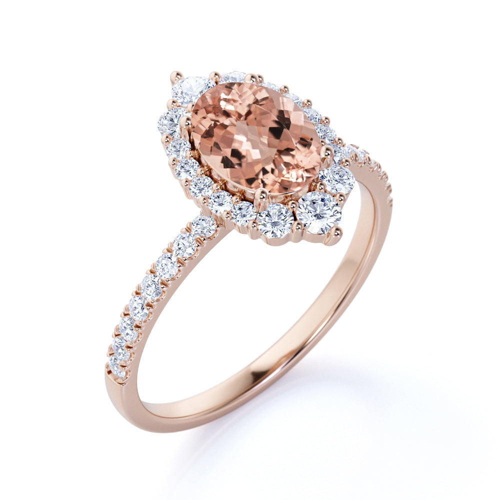 Shared Prong1.50 Carat Oval Shape Dark Pink Morganite and Diamond Halo Snowflake Engagement Ring in Rose Gold