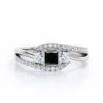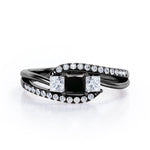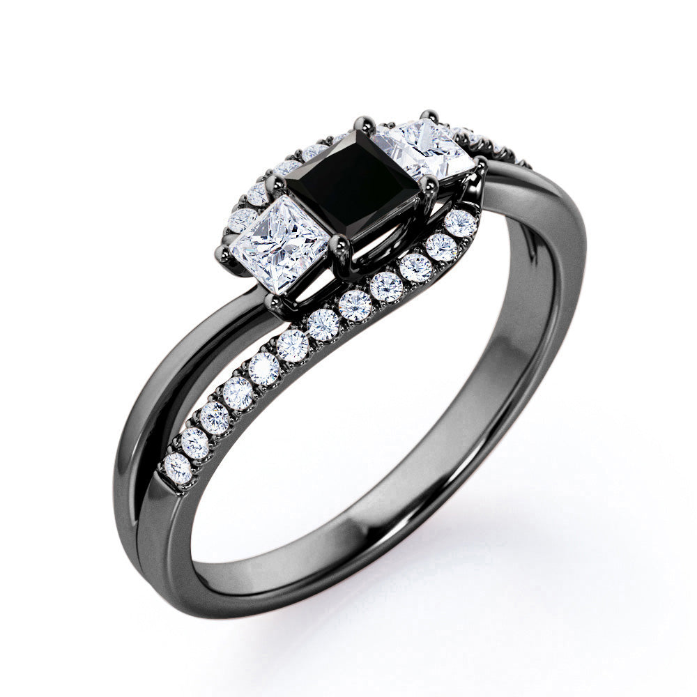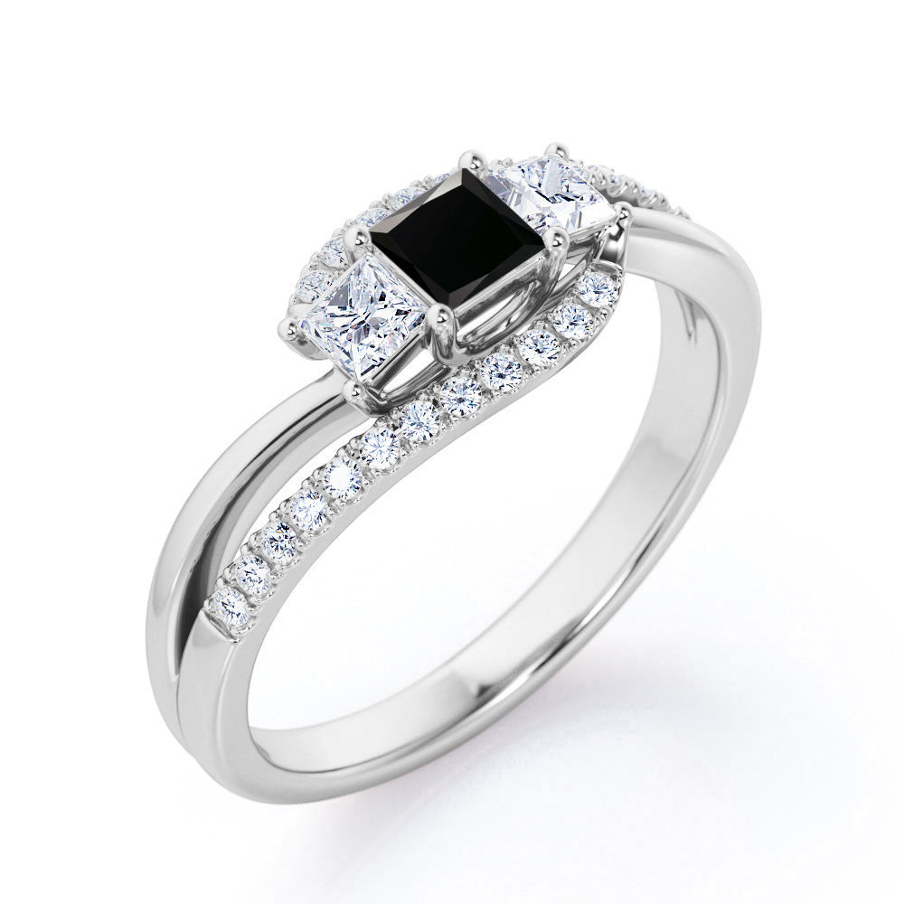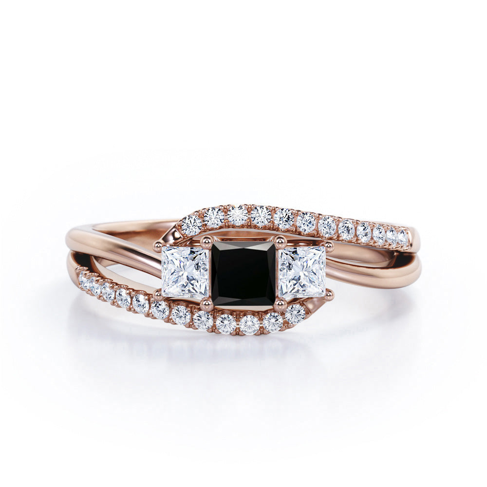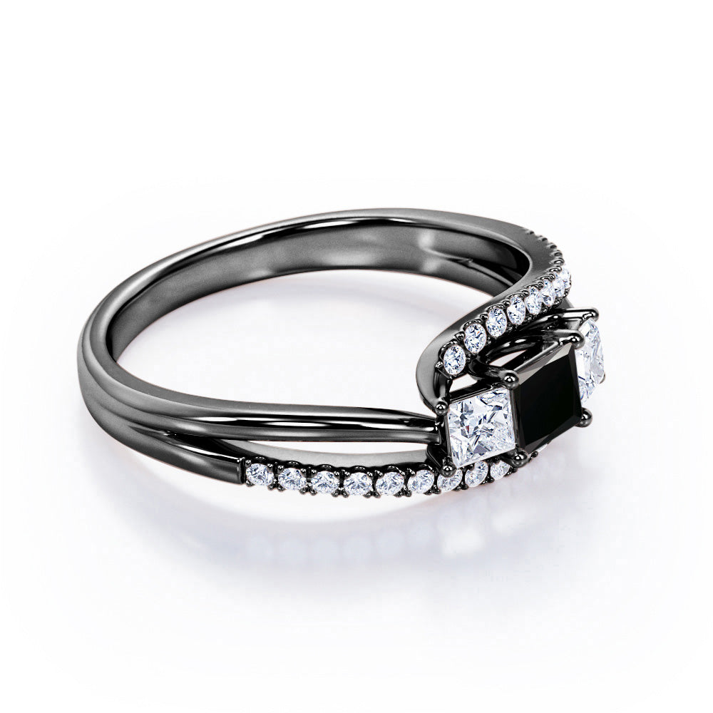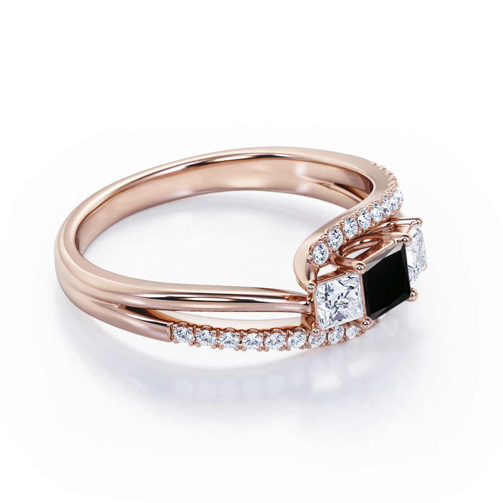 Classic and classy. Three stones of Moissanite are placed in the middle of a Shared Prongs 1 carat Princess Black diamond Split Shank Band Engagement Ring in Rose Gold; a 0.5 carat square cut Black diamond is located between two smaller square Moissanite. Split shank band features a paved round petite Moissanite by half of it like a mirror that also align with each other. As some people say, the smallest and simplest thing can hold up the biggest space in your heart, and so does this ring. It can be made in 18k gold over silver, 10k gold and 14k gold with the color of white gold, rose gold, yellow gold and black gold.