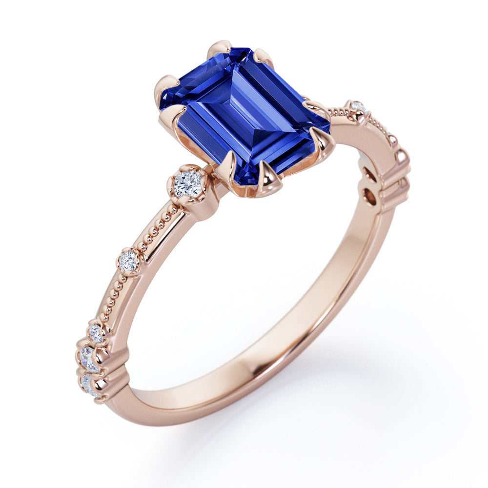 Sharp Eight Claws 1.10 Carat Emerald Cut Sapphire And Diamond Beaded Engagement Ring In Rose Gold. If you're in search of an antique engagement ring that feels one-of-a-kind but isn't too expensive, then you really can't go wrong with this emerald cut sapphire and diamond engagement ring. This vintage ring features one carat emerald cut sapphire as the center stone which is set in sharp eight claws and 0.10 carat diamonds in a rose gold band. The beaded work on the band is highly commendable job of our craftsmen which adds that antique vibes on this magnificent sapphire and diamond ring. This sharp eight claws 1.10 carat emerald cut sapphire and diamond beaded engagement ring in rose gold can also be customized to 18k Gold plating over silver, 10k Gold or 14k Gold as per your preference. Please note that if the ring is made over silver, the side stone will be moissanite and if it is made on gold, diamond will be employed as the side stone.