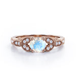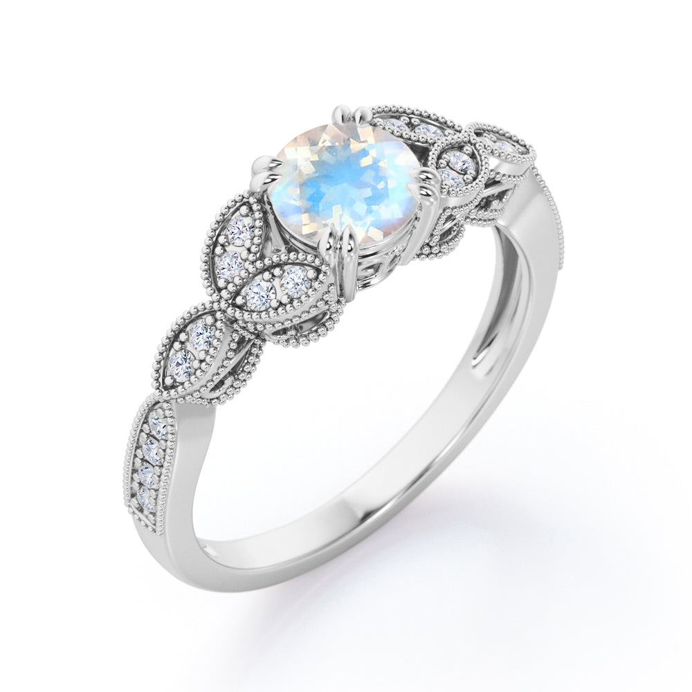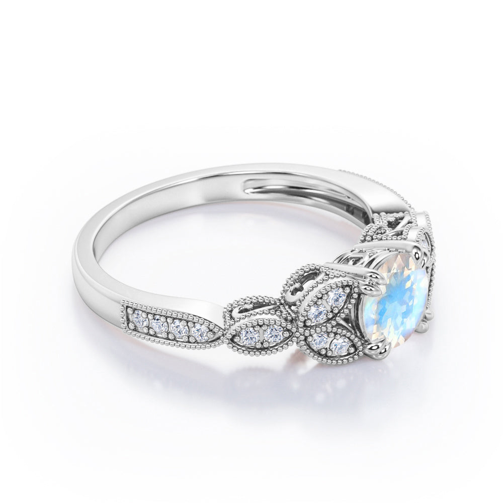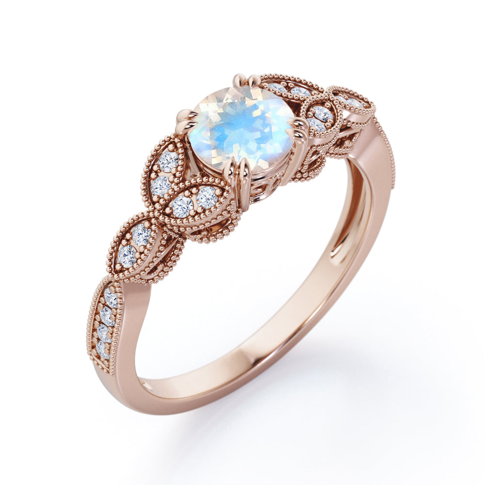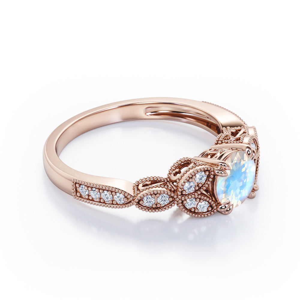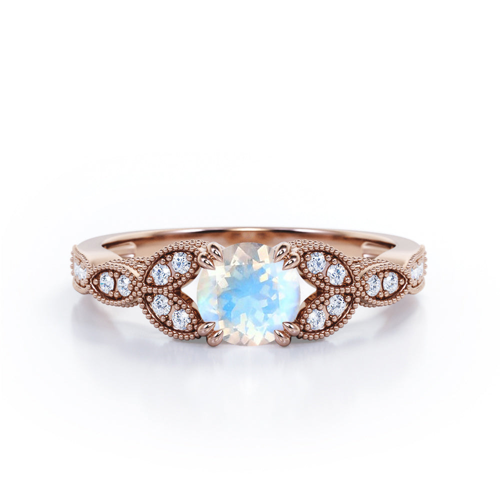 Sharp Eight Claws 1.35 Carat Round Cut Moonstone And Diamond Beaded Art Deco Engagement Ring In Rose Gold. Complete your vows with this art deco style ring and make your love story as antique as this engagement ring is. The floral pattern and vintage milgrain style adds a certain loveliness to the ring. Choosing the right wedding ring is very important as it will express your love and stir feelings of joy that will be unforgettable. Choose this round cut Moonstone ring and enter into a new journey of your life. Handmade with sincere love and devotion, this sharp eight claws 1.35 carat round cut moonstone and diamond beaded art deco engagement ring in rose gold can also be customized to 18k gold plating over silver, 10k Gold or 14k Gold as per your preference. Both breathtaking and timeless, this piece exudes effortless beauty. Please note that if the ring is made over silver, the side stone will be moissanite and if it is made on gold, diamond will be employed as the side stone.