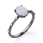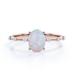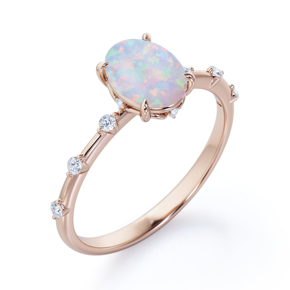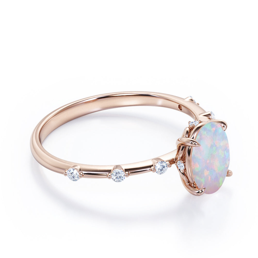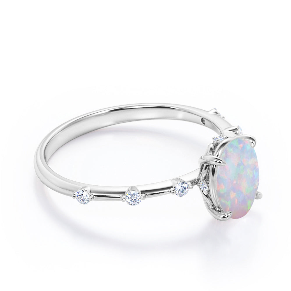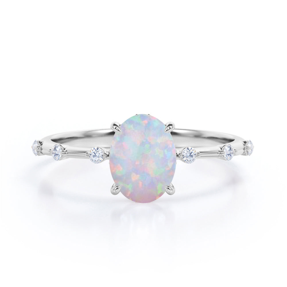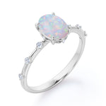 Sharp Four Claws 1.10 Carat Oval Cut Fire Opal And Diamond Seven Stone Engagement Ring In White Gold. If you're looking for deep meaning with your engagement ring stone, look no further. Known as "The Queen of Gems," opals have incredible significance attached to them. This seven stone opal and diamond engagement ring will create a timeless and fabulous look on your finger. This stunning engagement ring features 1 carat oval shaped opal at the center and 0.10 carat of dainty round cut white diamonds on the band with a certain gap in between. With its mesmerizing color change variety and unparalleled vibrancy, this flawless fire opal ring will enchant your special someone with gracefulness. Customizing your very own ring is the best way to get the look you love at a price point that works for you. As all our products are handmade by our experienced artisans, this sharp four claws 1.10 carat oval cut fire opal and diamond seven stone engagement ring in white gold can also be customized to 18k Gold plating over silver, 10k Gold or 14k Gold as per your preference.