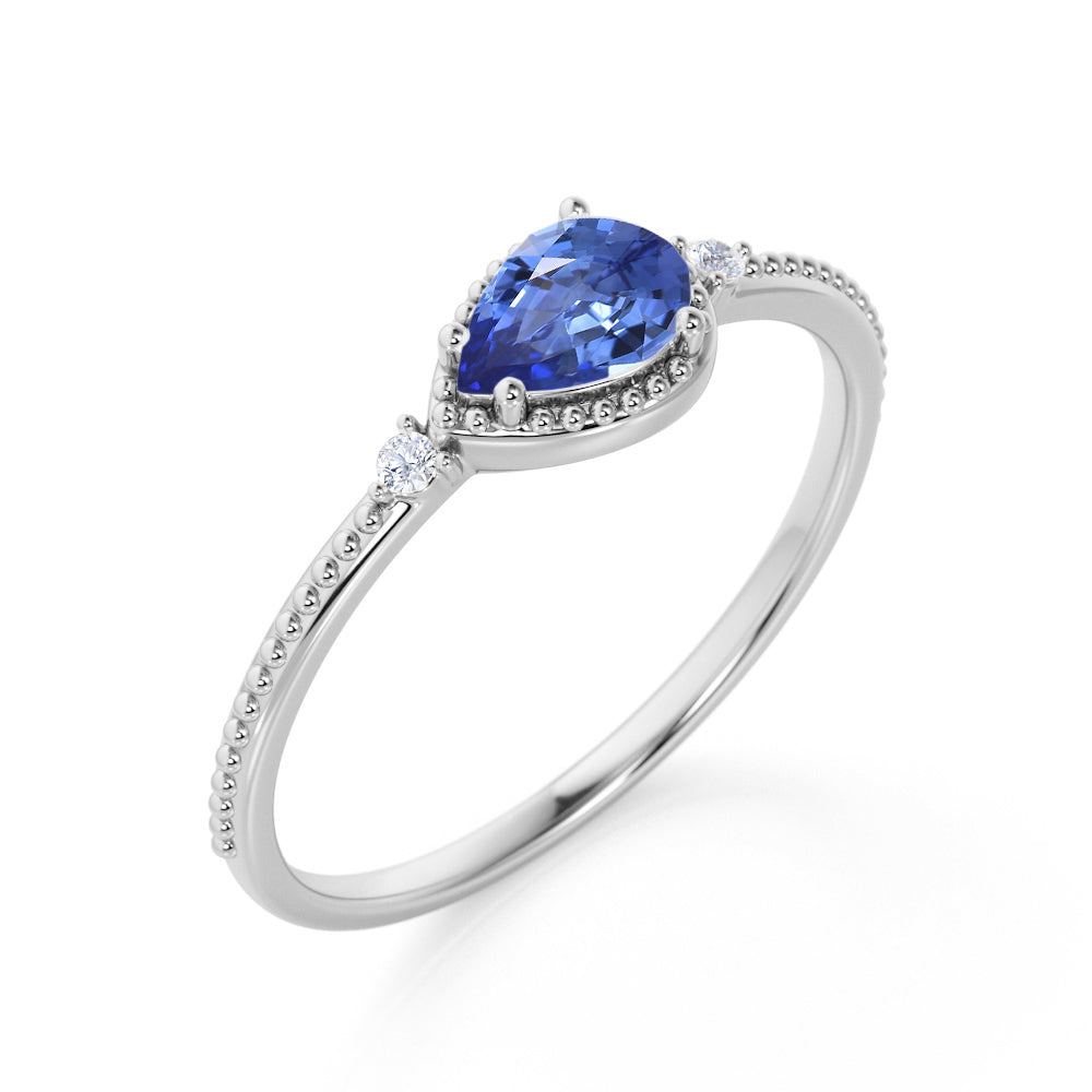 This blue Lab-Created sapphire is best for engagement ring or proposal ring. The vibrant color of this ring brings life to the fullest. This sapphire ring features an approximately 1 carat pear shape Lab-Created sapphire, surrounded by .05 carat certified side diamonds, for a total weight of 1.05 carats.