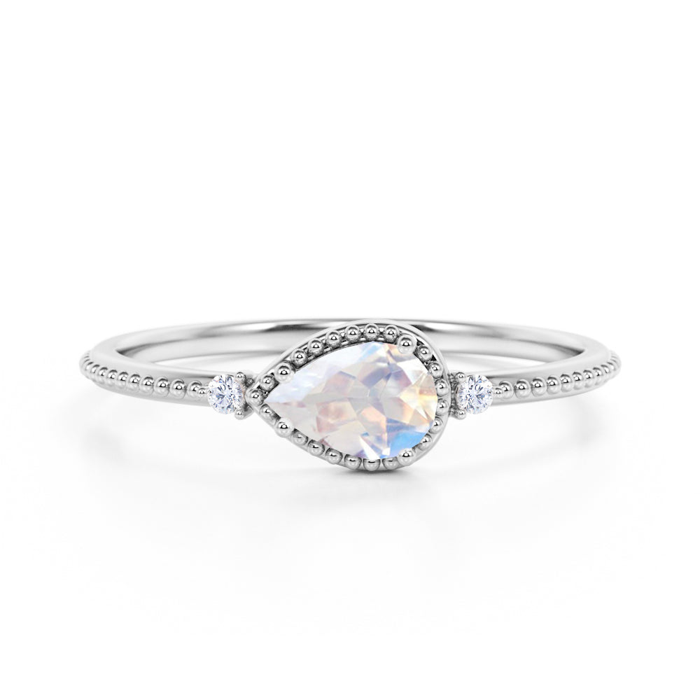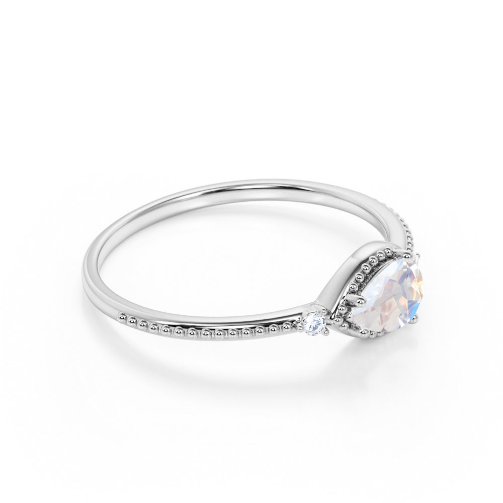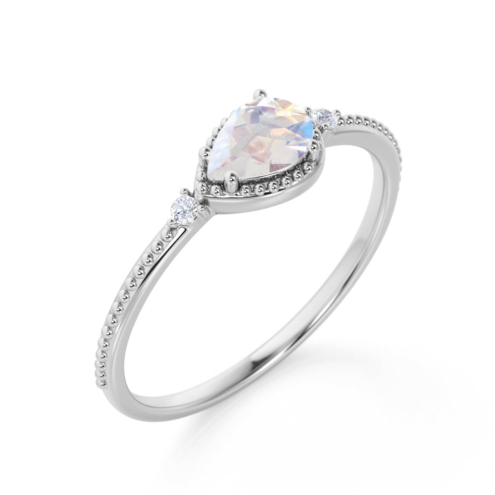 Sideways 1.10 Carat Pear Rainbow Moonstone and 3 Stone Diamond Elegant Engagement Ring in White Gold