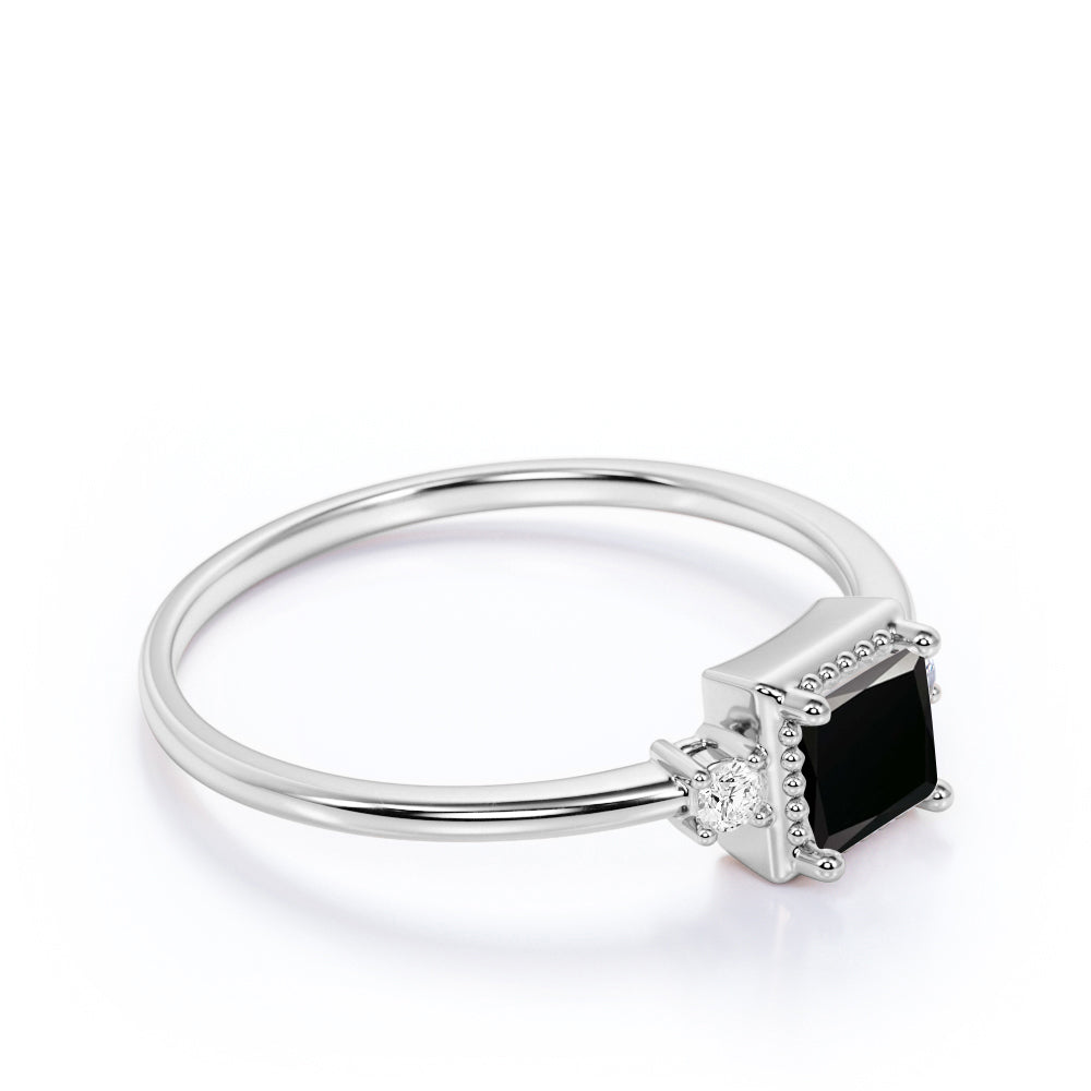 Simple 3 Stone Design 0.85 Carat Square Cut Lab Black Diamond and Vintage Engagement Ring in White Gold