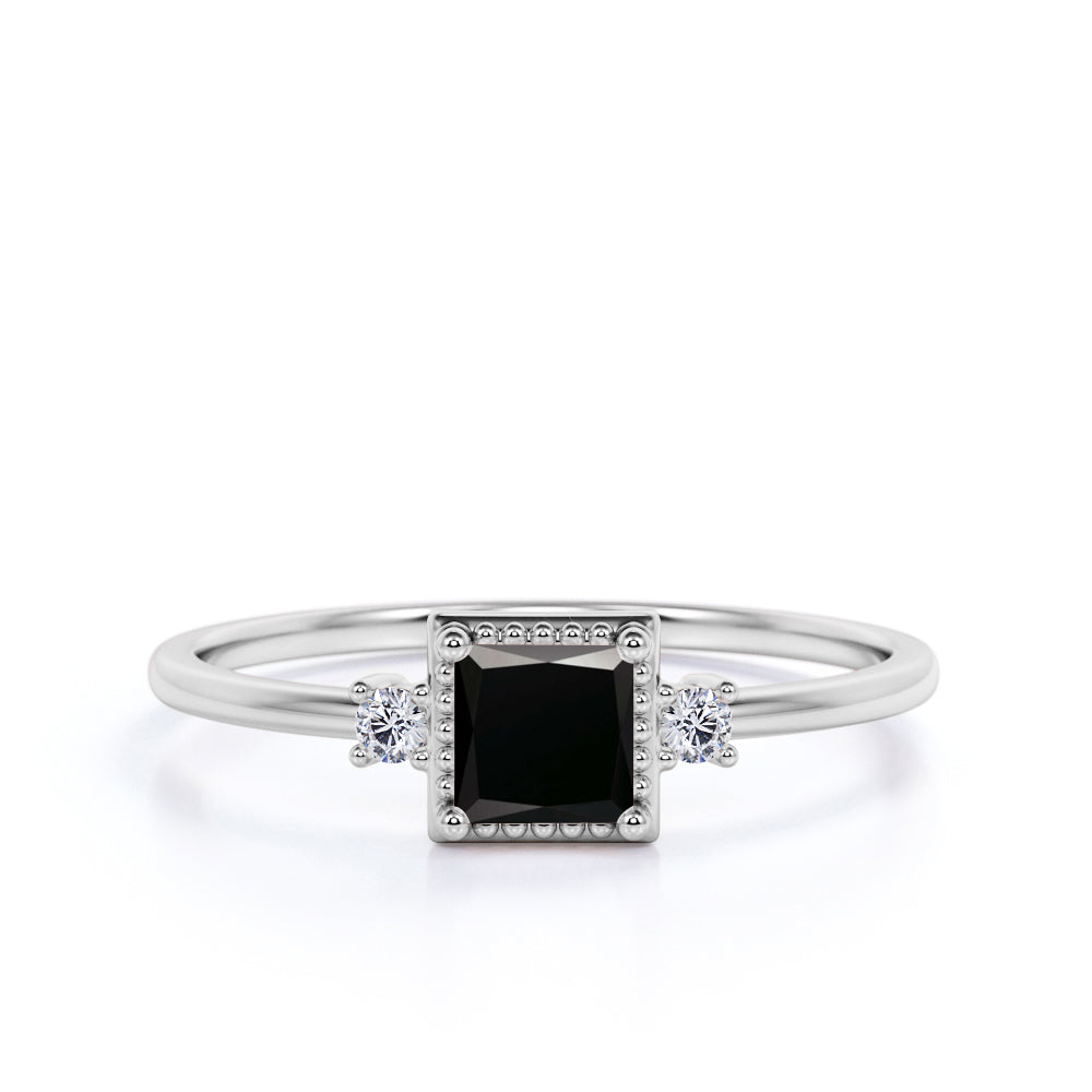 Simple 3 Stone Design 0.85 Carat Square Cut Lab Black Diamond and Vintage Engagement Ring in White Gold